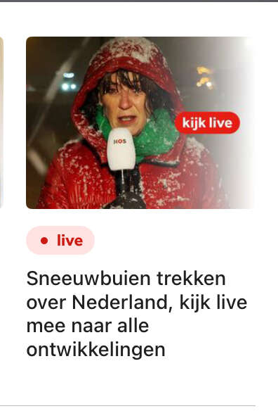Ik vind de liveverslaggeving van de NOS wel echt genieten. Updates van de sneeuwverwachting, de situatie op schiphol en bij ziekenhuizen en tussendoor beelden van snelwegen