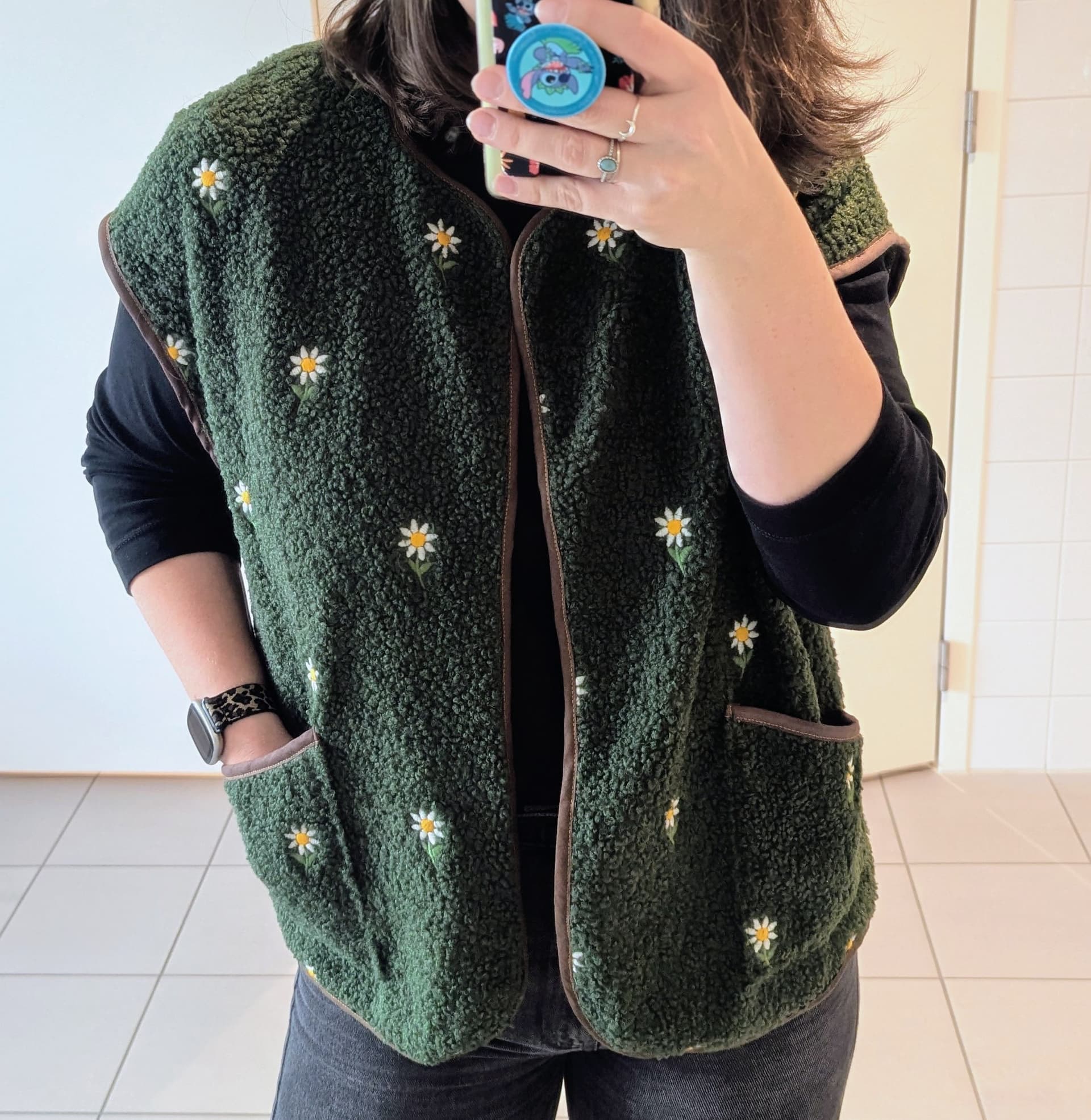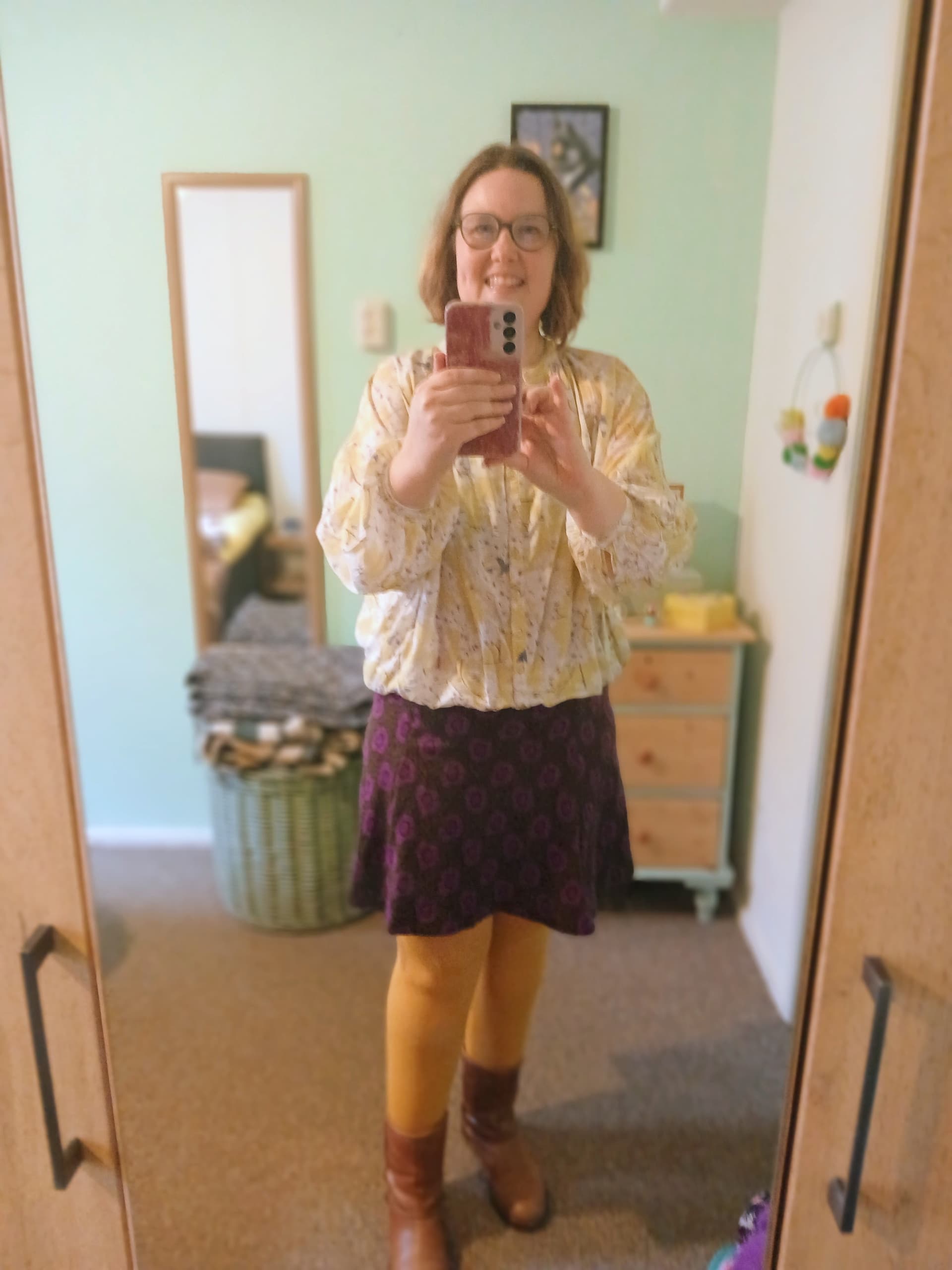 Ik heb hier een wollen rokje aan van vinted en een blousje die ik heb gevonden bij een weggeefkast.
