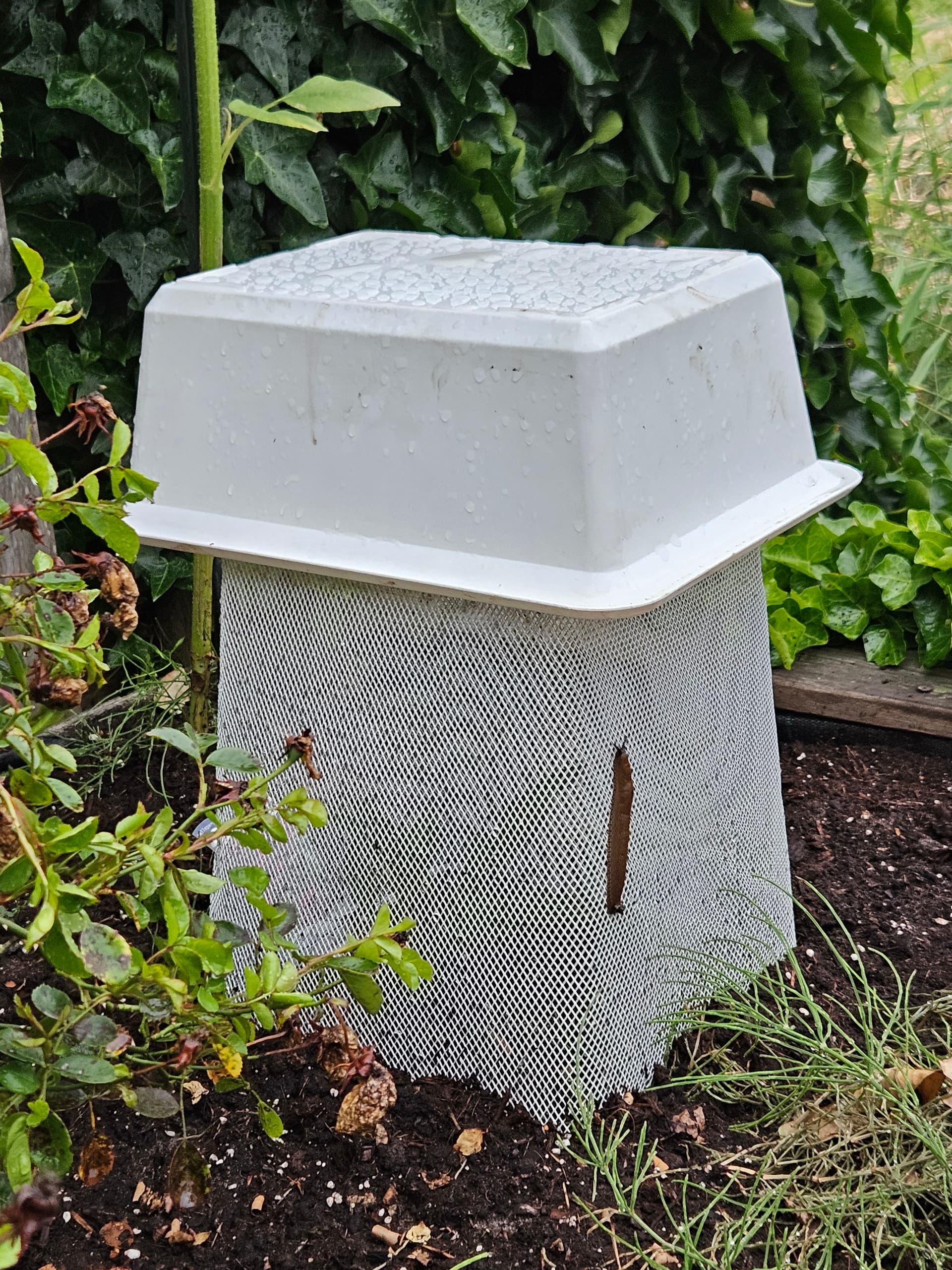 Maar zo makkelijk laat ik me niet verslaan. Ben opzoek gegaan naar een alternatief voor de yoghurtcontainer, en heb uiteindelijk een prullenbak van mijn vader ‘geleend’ Kom ik net in de tuin: