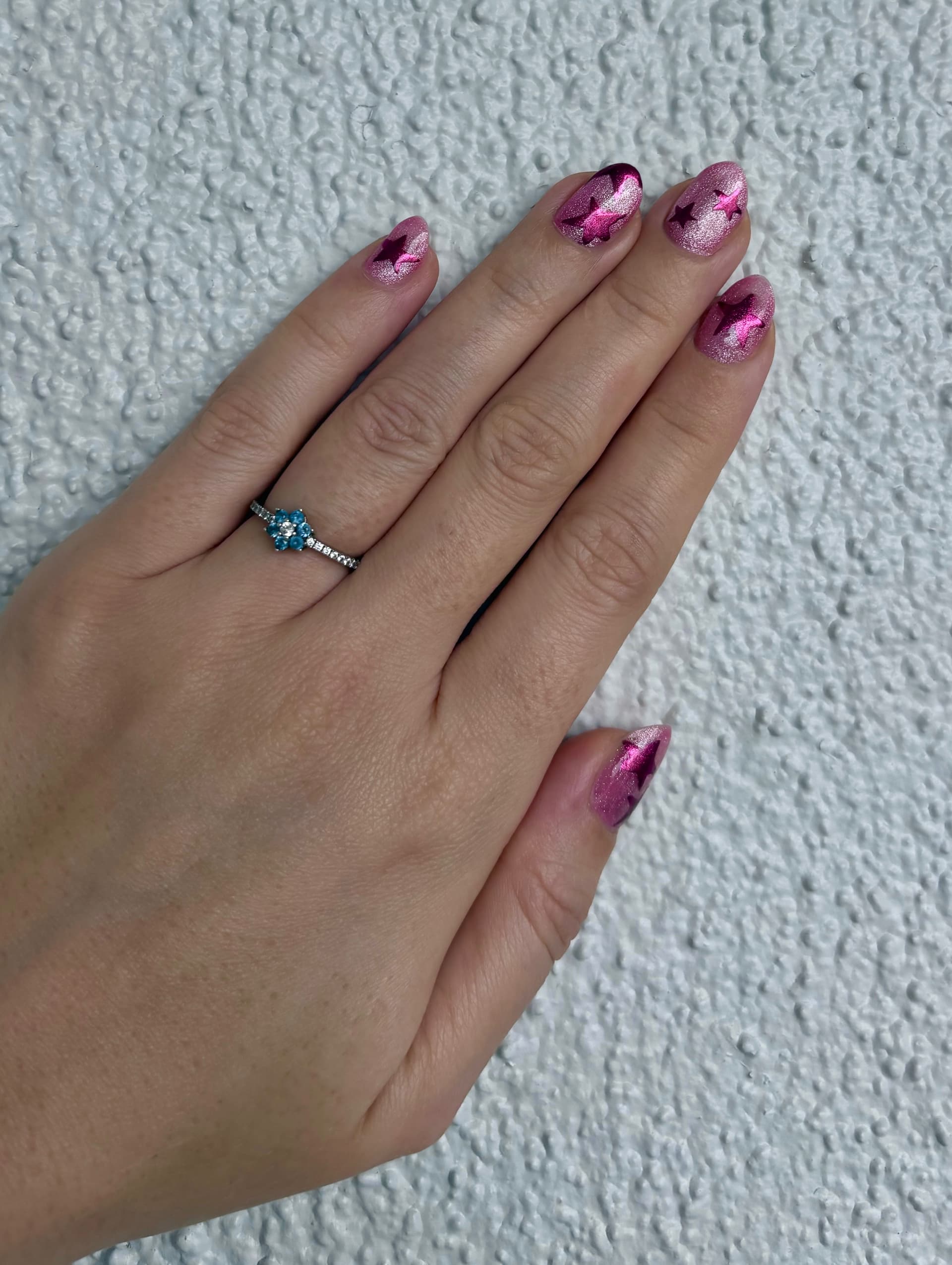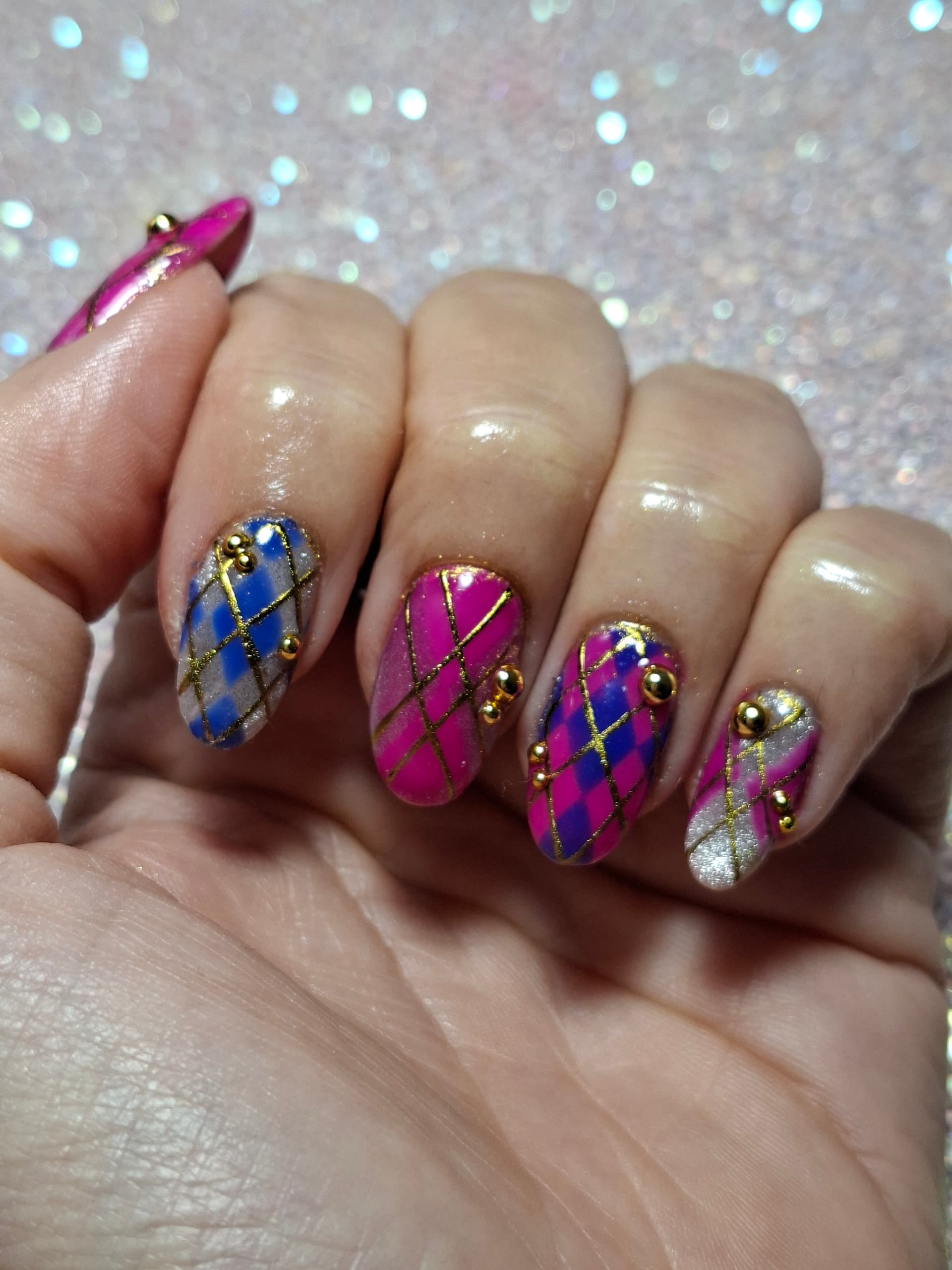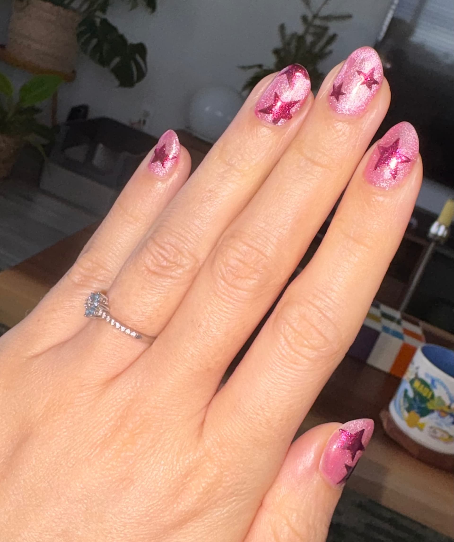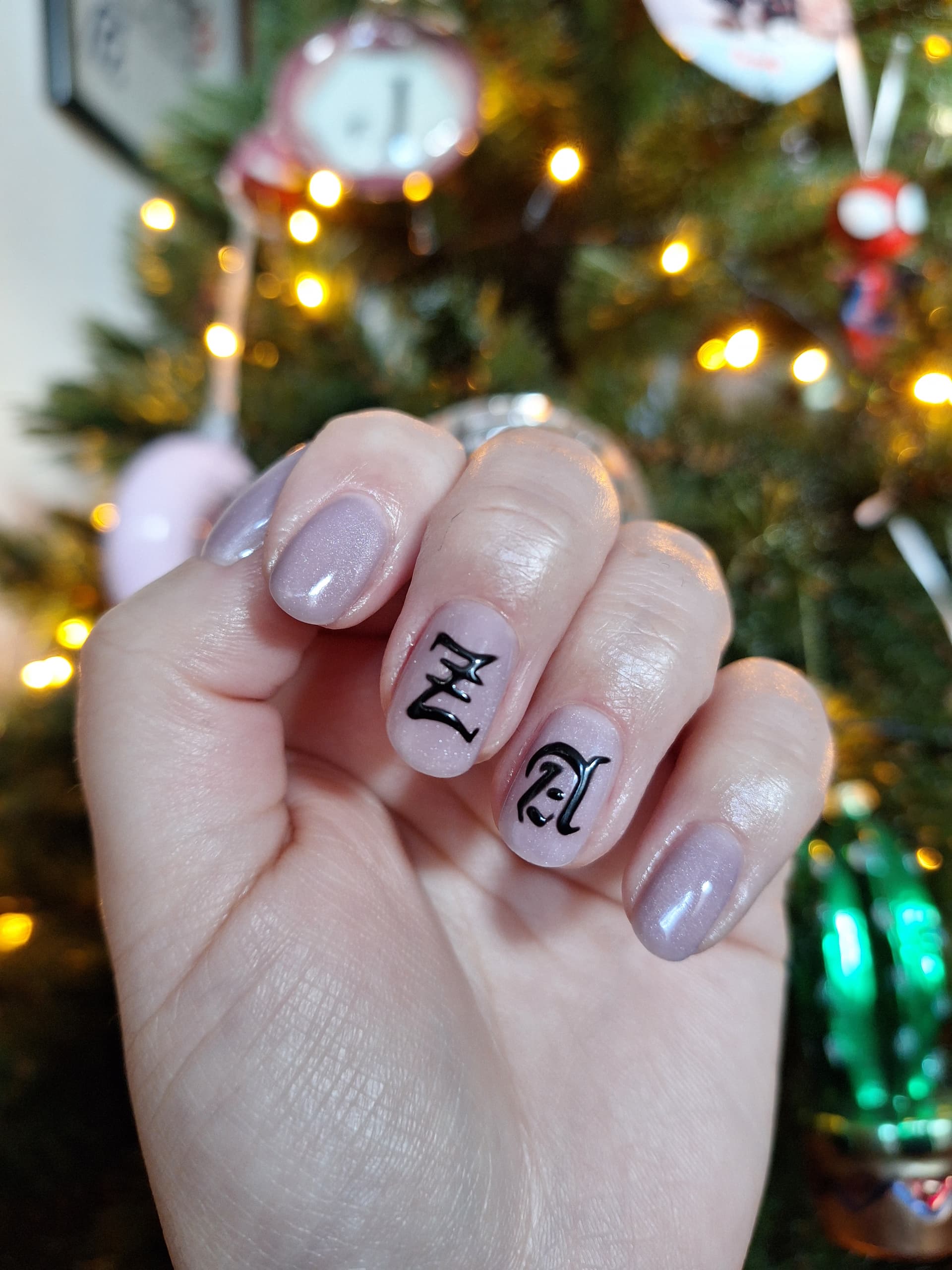 Is al bijna tien dagen op mijn nagels, het is een cateye met matte topcoat en dan heeft mijn stylist nog met glanzende topcoat wat versieringen aangebracht.