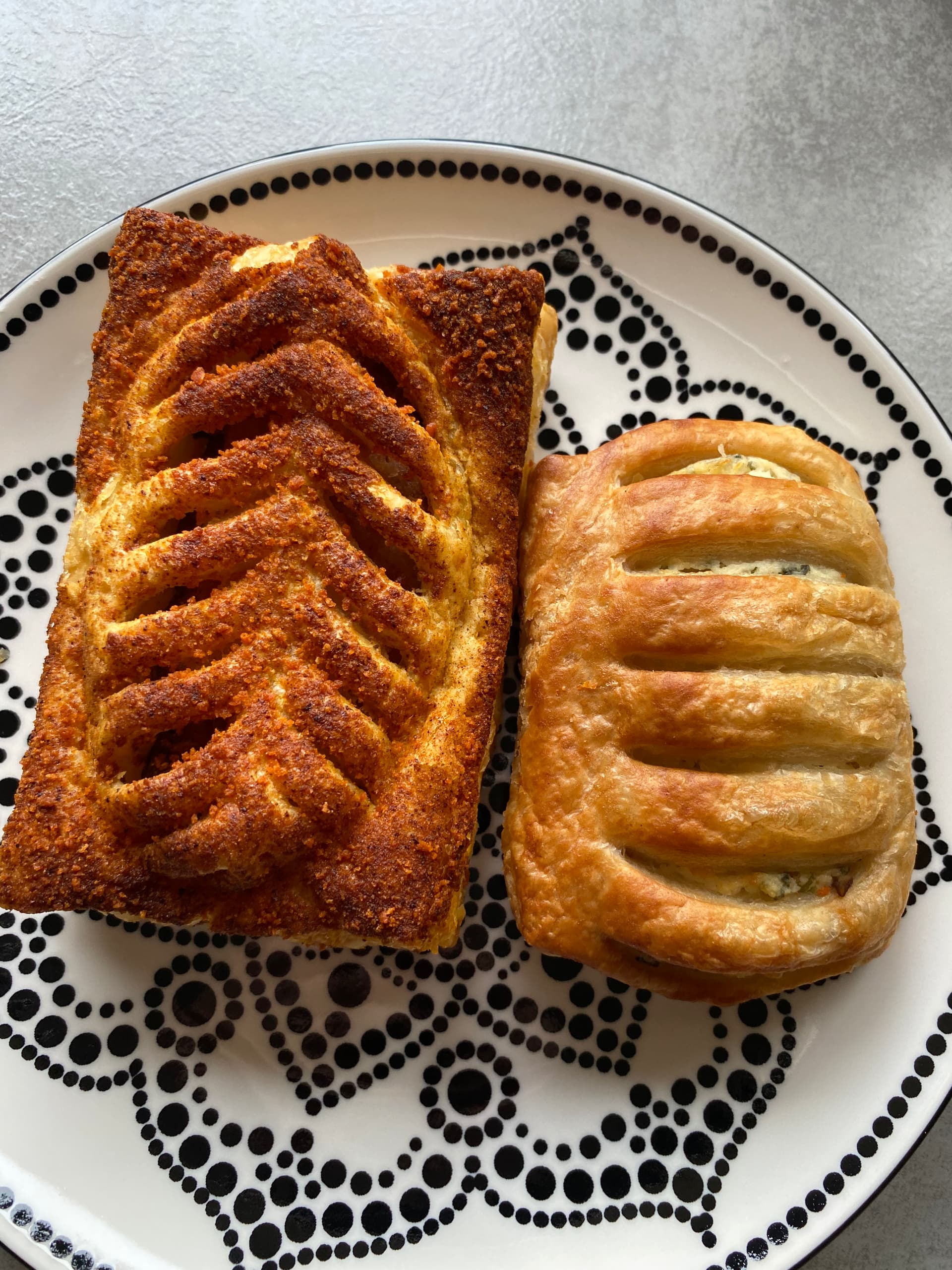 Dat kleine broodje is met kruidenkaas. Gewoon een soort Paturain in bladerdeeg. Wel lekker, niet heel bijzonder.