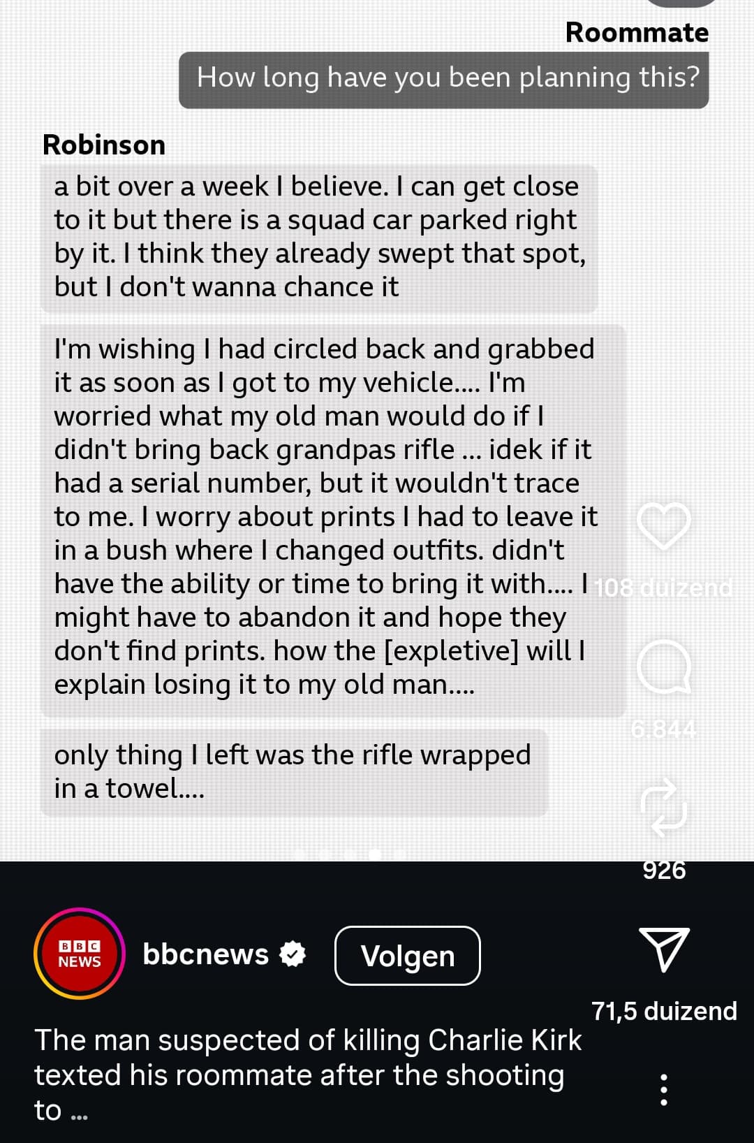 Ok ik zit nu in de rabbithole over Charlie Kirk zân moord. Schijnt dat hij geld van Satanyahu heeft geweigerd, hij onder druk werd gezet om zijn mening over Israhel te veranderen (want schijnbaar heeft hij zich daar onlangs over uitgesproken) en dat de shooting wellicht vanuit die hoek is gekomen?! Wait whutt