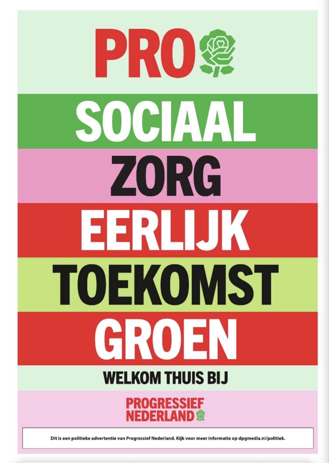 Ben wel benieuwd waar het roze vandaan komt, dat was nog geen onderdeel van de twee oude partijen toch? En voor mijn gevoel een weinig gebruikte kleur bij andere partijen, best een goede keuze!