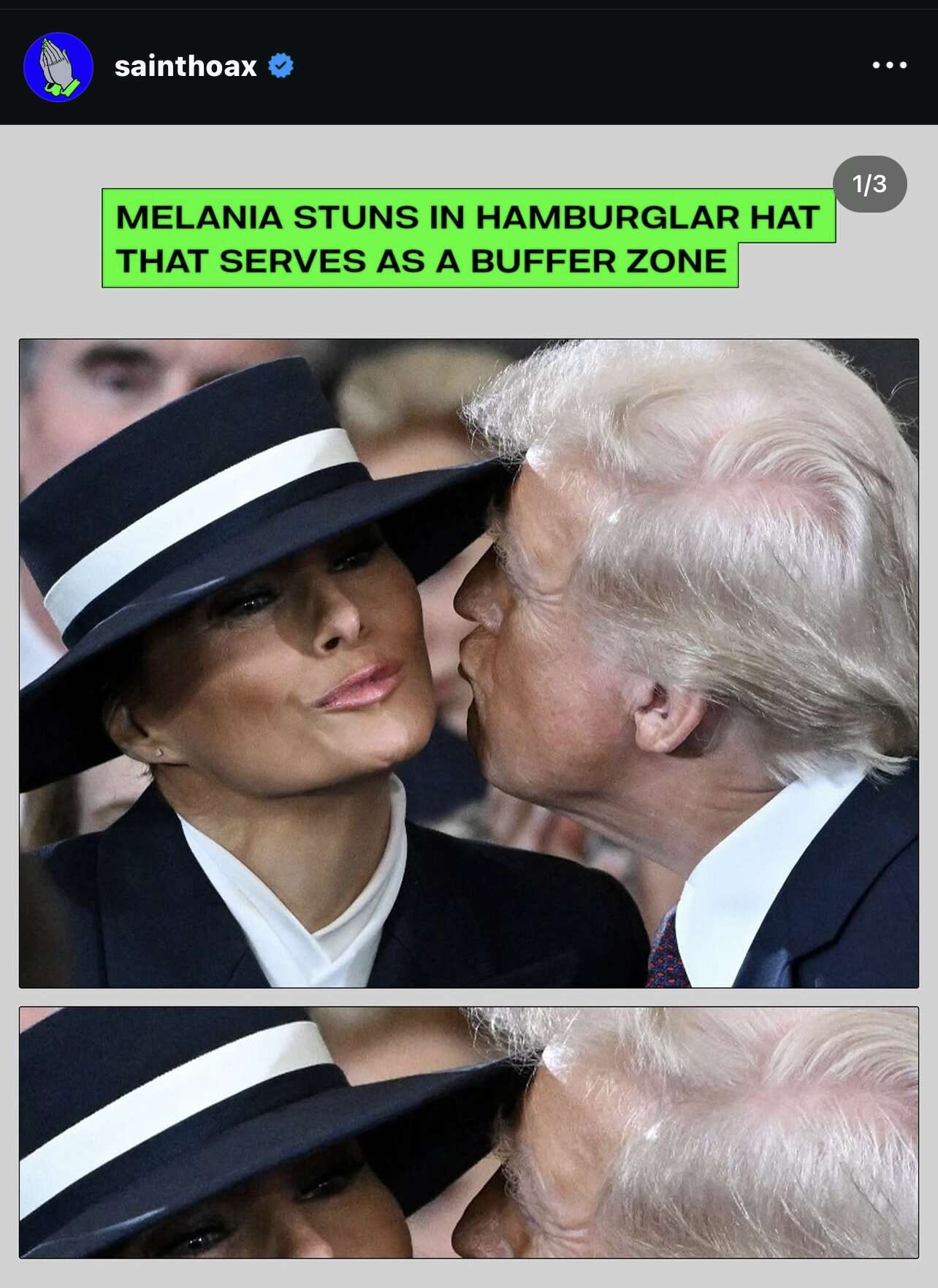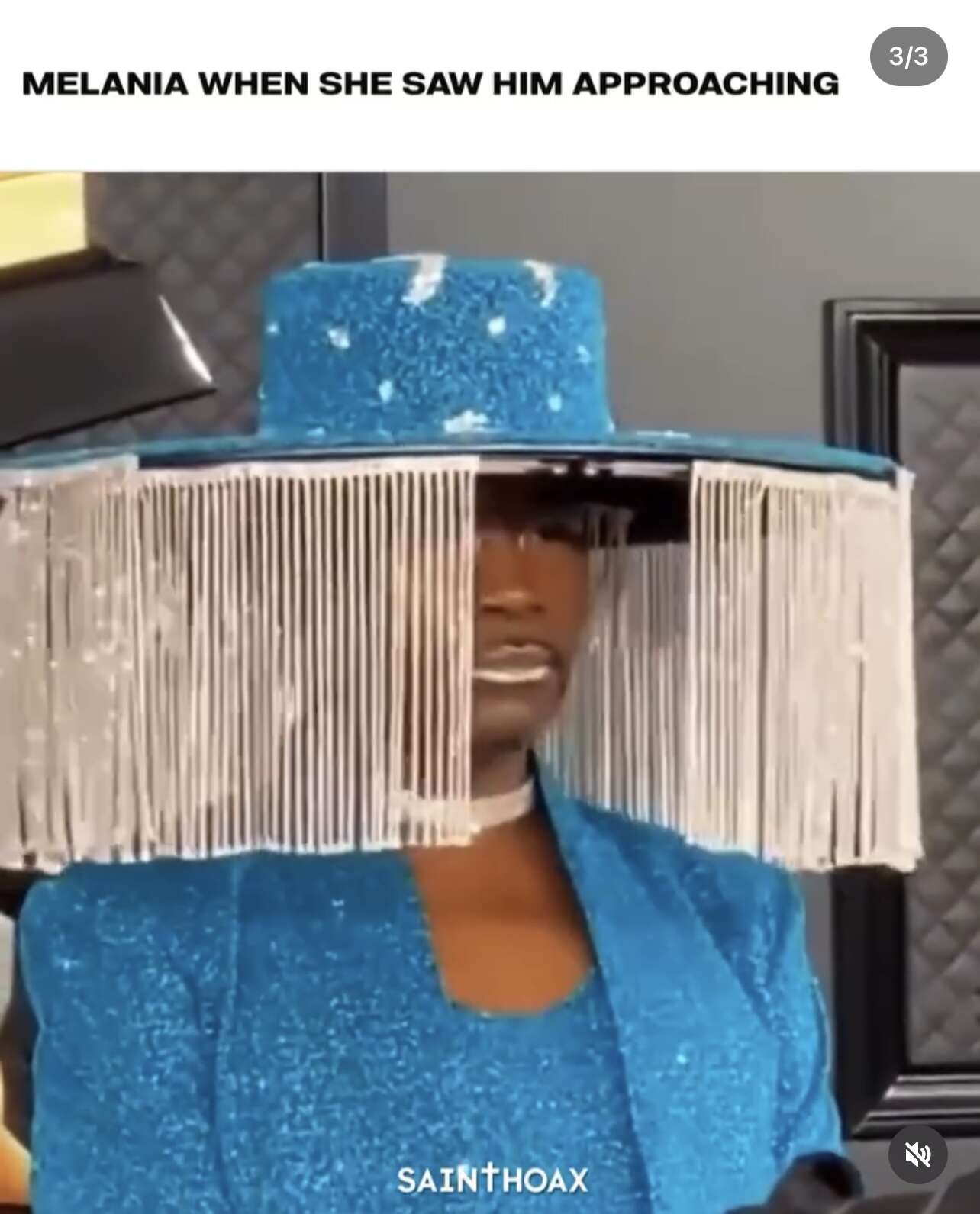 Melania Trump draagt de hoed van Michael Jackson uit Smooth Criminal en Ivana draagt de outfit van Serena uit handmaids tale haha