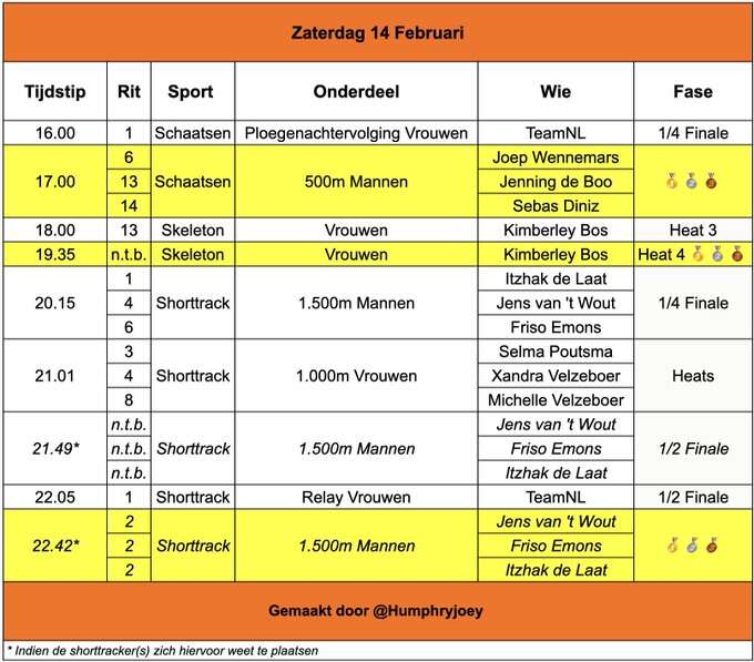 Een heerlijke sport-dag op de planning. Dag 8 alweer en een vol programma vanaf 16.00u met ruimte voor langebaanschaatsen, shorttracken en skeleton. We beginnen met de ploegenachtervolging voor vrouwen waar Nederland aan de start zal verschijnen met Joy Beune, Antoinette Rijpma-de Jong en Marijke Groenewoud. Dit zijn wel pas de kwartfinales maar die moet Nederland in principe met gemak doorkomen. Meteen daarna gaan we door naar de 500 meter voor mannen, of Joep Wennemars hier al revanche kan nemen voor zijn verpeste 1000 meter, ik denk het niet per se maar hopelijk kan hij wel een mooie rit neer zetten. Voor Jenning de Boo gaat het weer een race tegen Jordan Stolz worden, zij zijn erg aan elkaar gewaagd en rijden ook tegen elkaar in rit 13. Sebas Diniz (certified hottie volgens jullie) gaat zijn Olympisch debuut maken in de voorlaatste rit. Kimberley Bos heeft gisteren tijdens heat 1 en 2 geen geweldige tijden neergezet, momenteel staat ze 13e in het klassement dus een kans op een medaille is klein.