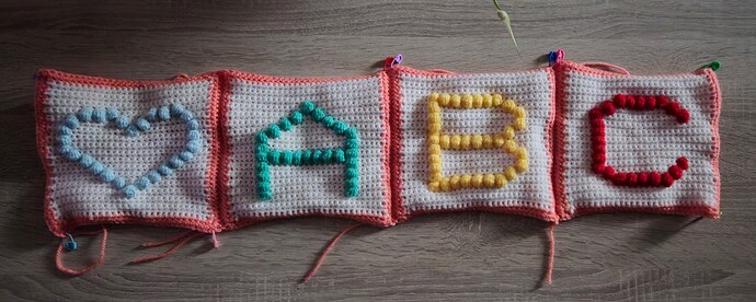 Nee het is dan omgeslagen om de rand vh gehaakte heen. Dus je pakt steken op en breit een stuk en maakt het dan aan de achterkant vh werk vast, dat het er echt omheen gesandwicht zit. Omdat t om dat gehaakte heen zit is t wat dikker