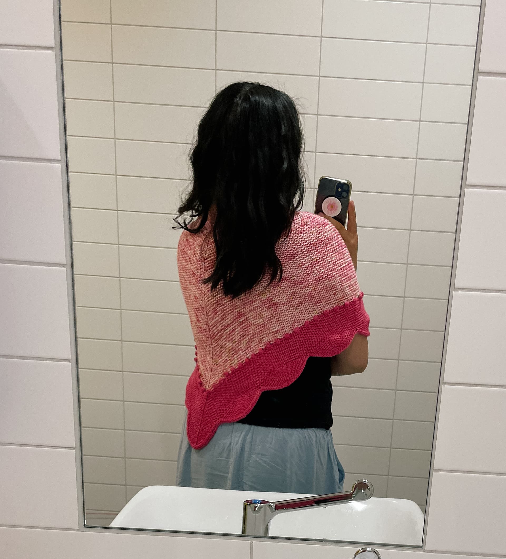 Het gaat eigenlijk om dat laatste stukje. Die groen gemarkeerde cijfers zijn mijn maat. Er staat ‘a total of 32 rows’ maar waar begin je die 32 te tellen? Vanaf de pickups van het schouderstukje? Vanaf de cast-on’s van het aan elkaar verbinden van de achterkant? Of vanaf de repeats van row1-row2?