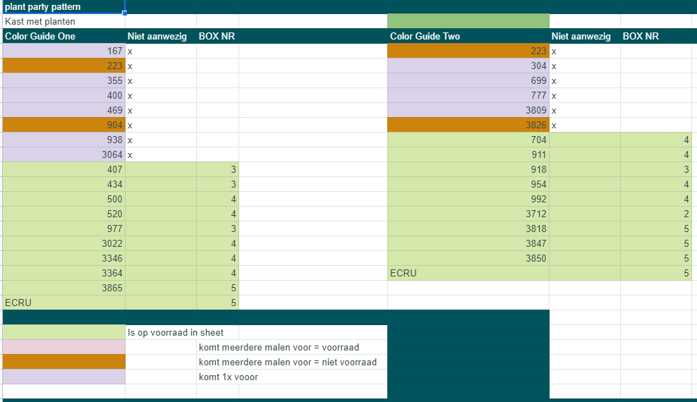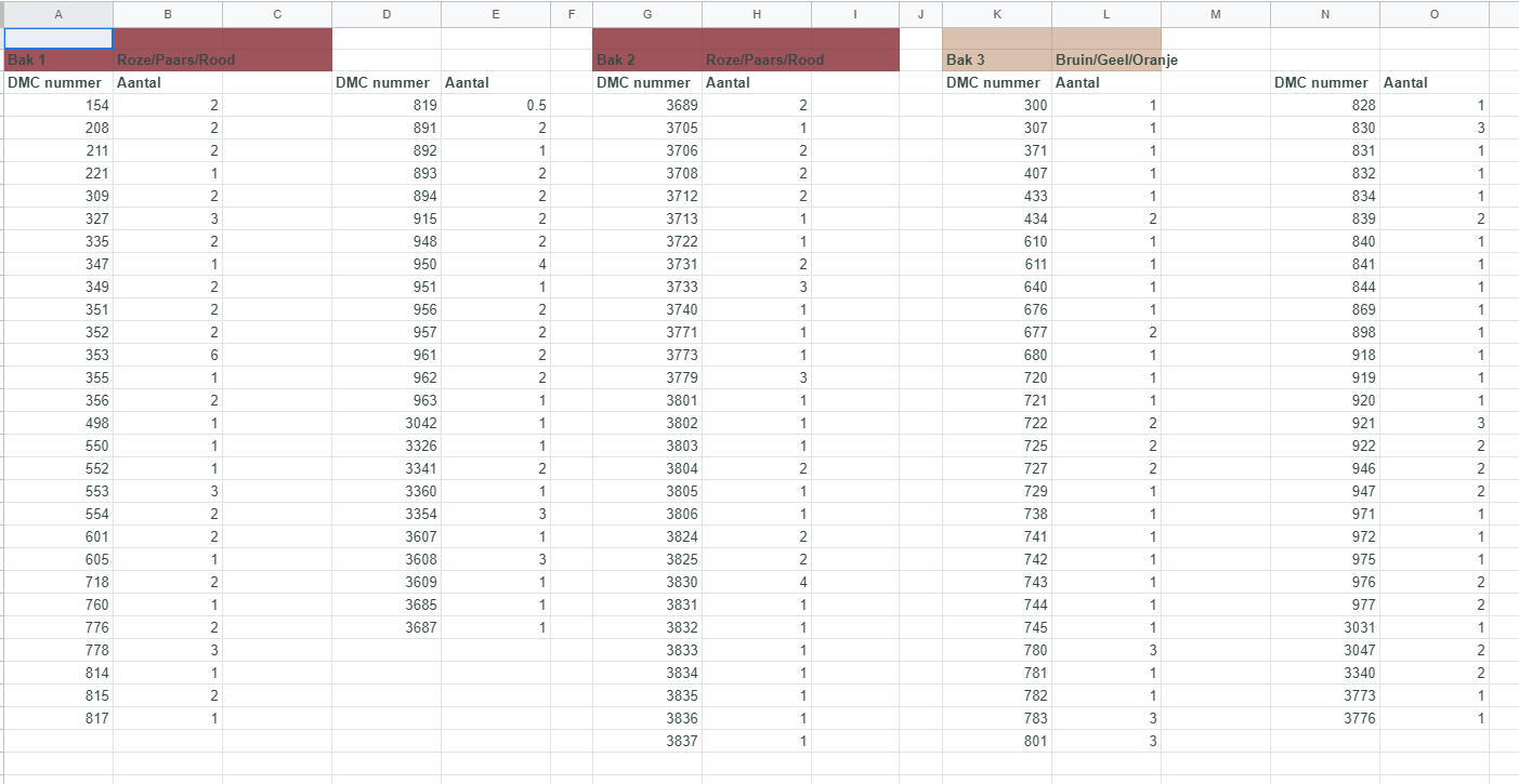 Gewoon simpelweg dit. dan kan ik als ik een patroon koop gewoon CTRL F gebruiken en het nummer in tikken. Heb alle vijf de bakken met kleuren hier in staan en dan aparte tabbladen voor de patronen op kleur.