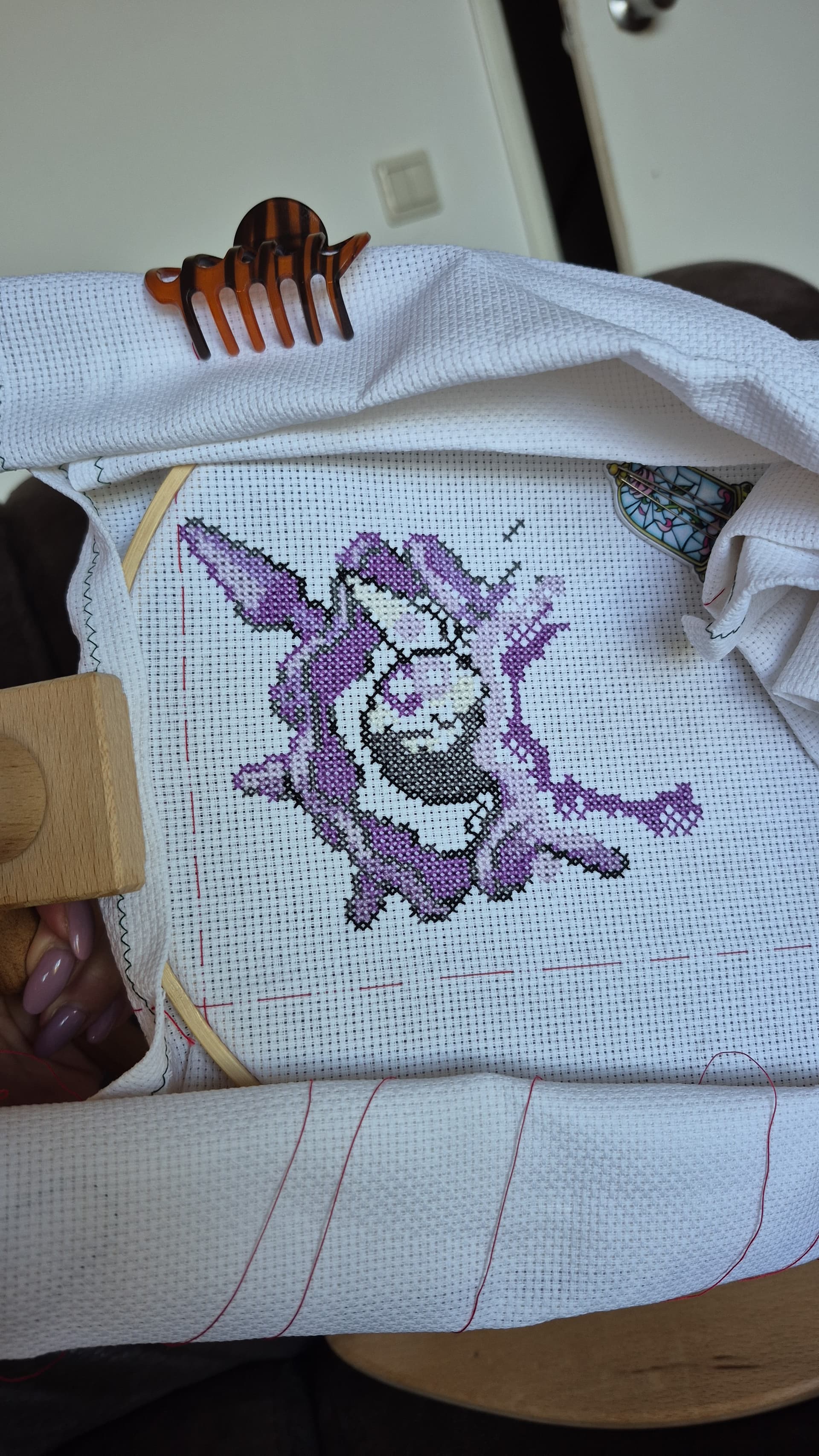 Inmiddels heb ik een begin gemaakt met het pokemon patroon maar ik heb het een beeeeetje onderschat van tevoren toen ik zag dat het een stuk borduurstof was van 110 cm x 110 cm. Zit ook continu heel erg in de weg tijdens het borduren dus daar moet ik ook nog even betere manier vinden om het weg te werken. Ik gebruik nu een app om af te strepen, werkt echt fantastisch dus dikke aanrader, vooral met grote patronen. Maar goed, heb er nu al ruim 10 uur inzitten en zit volgens die app op 0,76 % dus dit gaat nog wel even duren haha