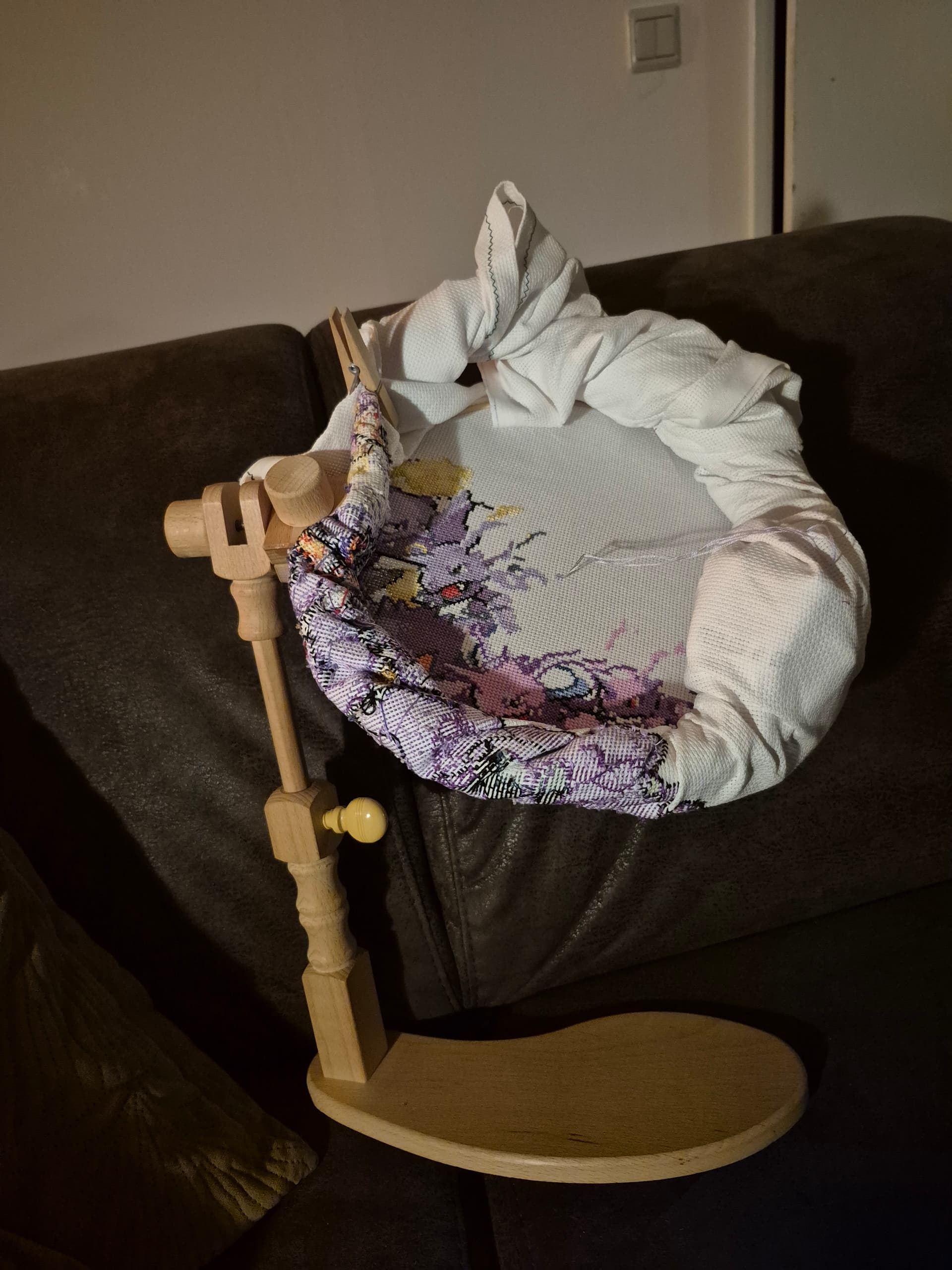Na 3 maanden m’n project weer tevoorschijn gehaald. Moest ook wel want ik moet het over 2 weken weggeven aan de vriendin waar het voor is. Heb de stof iets te strak gespannen tijdens het borduren, maar misschien kan ik dat nog rechttrekken bij het inlijsten. Had het tijdens het drogen al strak gespannen en het is al een stuk beter dan het was.
