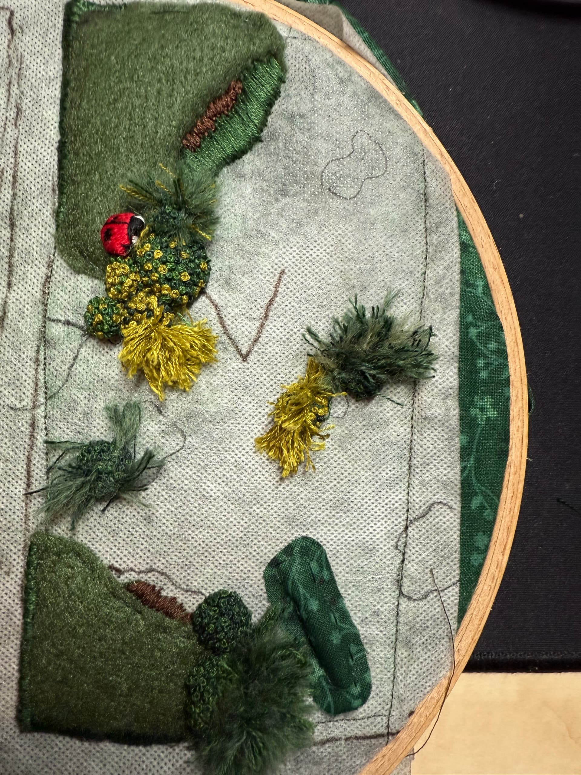 Die rare groene worm onderin, wordt het lijfje van de vlinder. Het is gemaakt met viltwol met wat stof eroverheen (borduurt straks wat lekkerder)