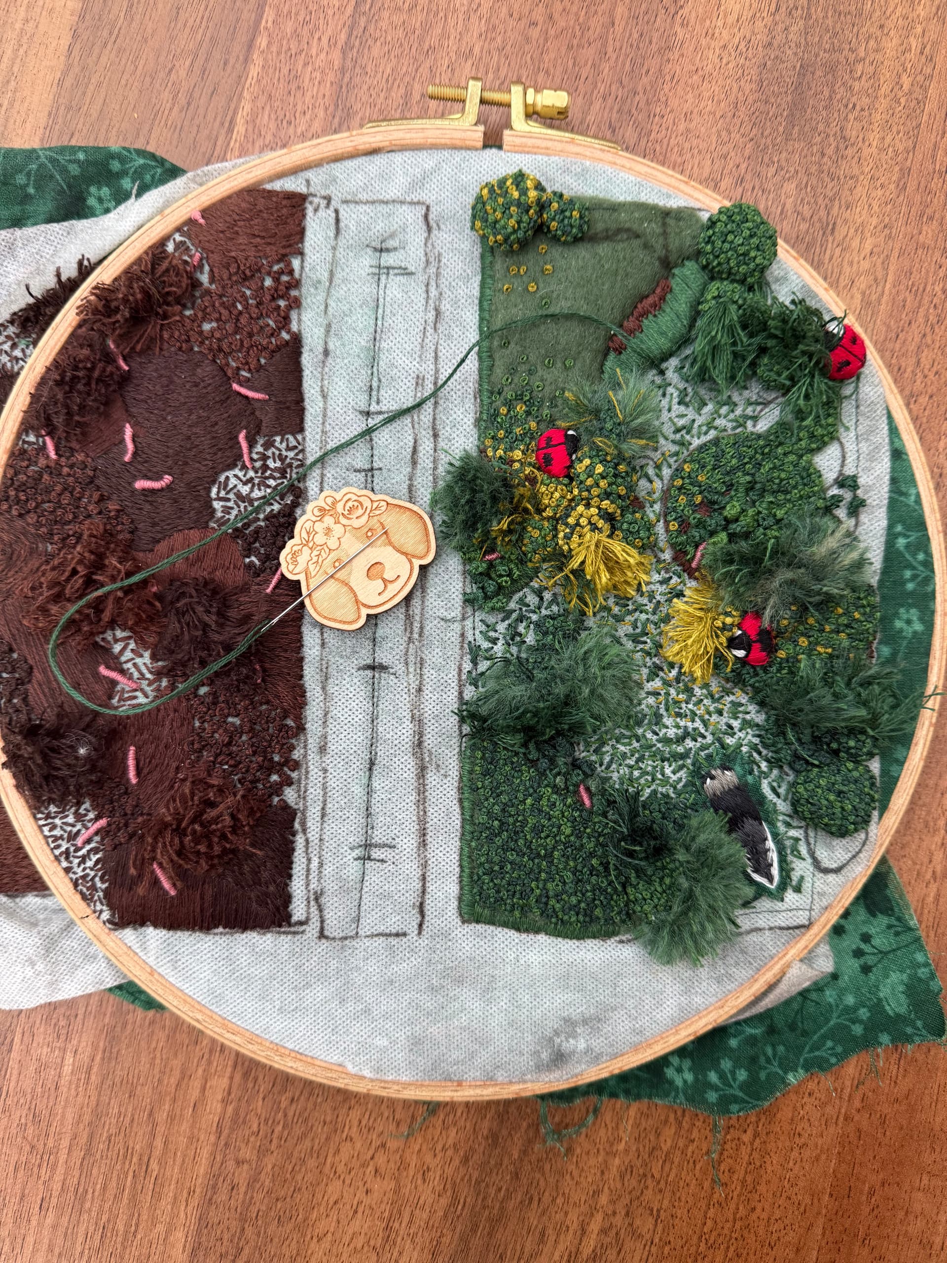 In één van de workshops ging je een sigil voor jezelf maken (sigil = sacred symbol). Vroeger naaiden ze die bijvoorbeeld in de jassen van mannen die de oorlog in gingen, voor geluk. Ze nam je mee in verschillende manieren hoe je zo’n vorm kan ontwerpen en ook hoe je het kan gebruiken. Deze maakte ik voor mezelf, een klein lapje met persoonlijke betekenis: