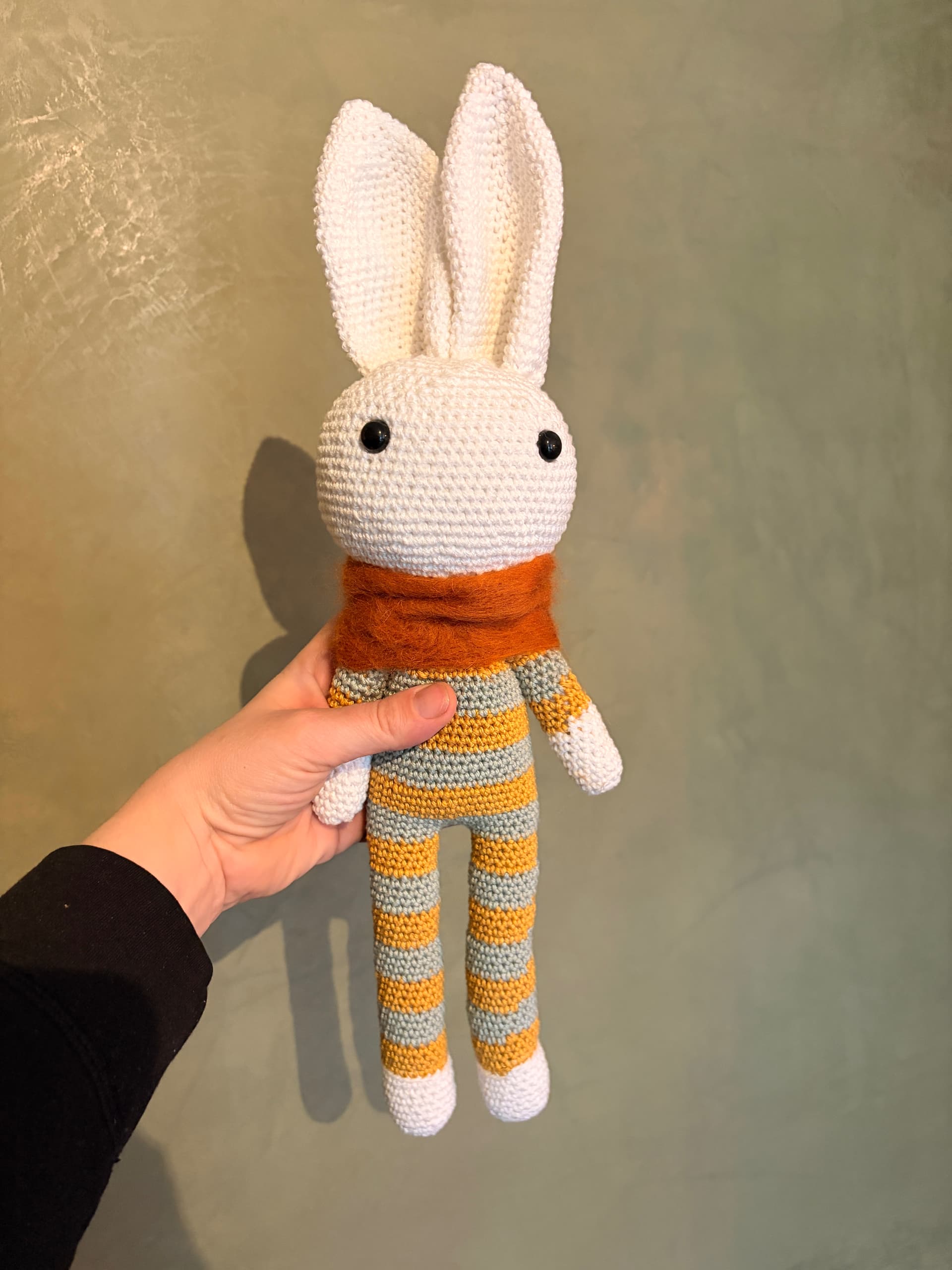 Hier ben ik wel blij mee! Voor zwangere collega. Zit een rammelaartje in en de sjaal heb ik gevilt met naaldvilten.