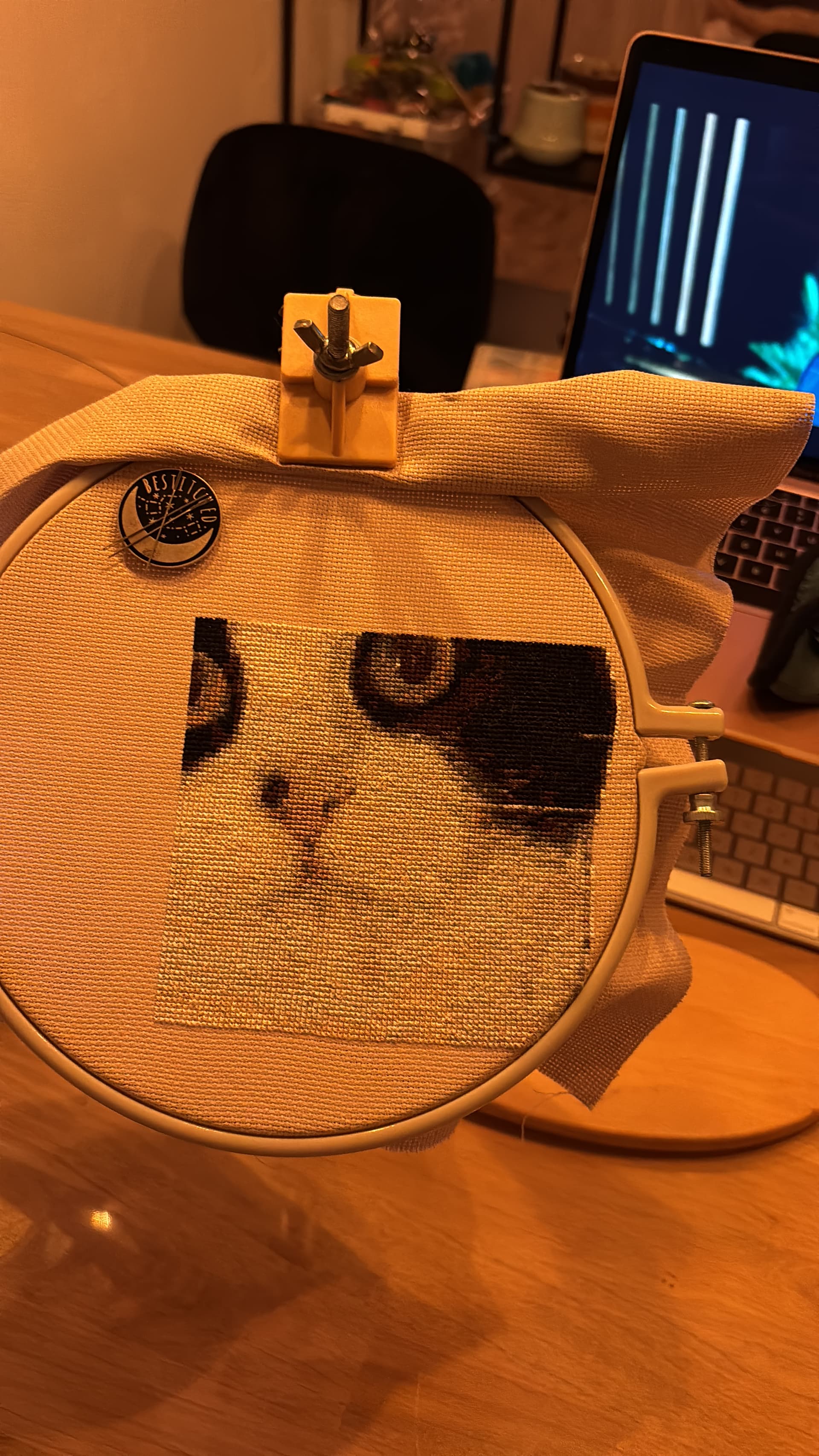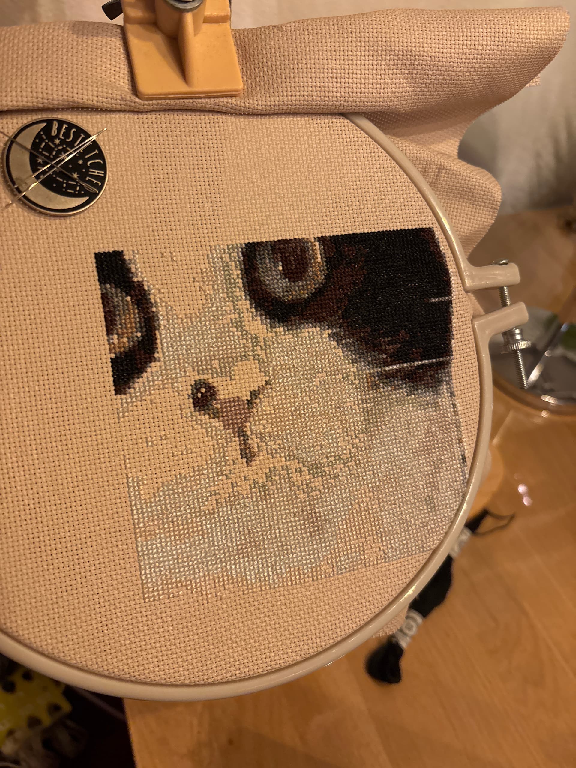 Gekregen van iemand van mijn moeder’s handwerkclubje (waar iedereen eigenlijk haakt of breit). Die handwerkclubmaatje heeft het weer gekregen van haar buurvrouw. Maar ja zij borduurt niet. Dus ik mocht het, gratis en voor niks, krijgen.