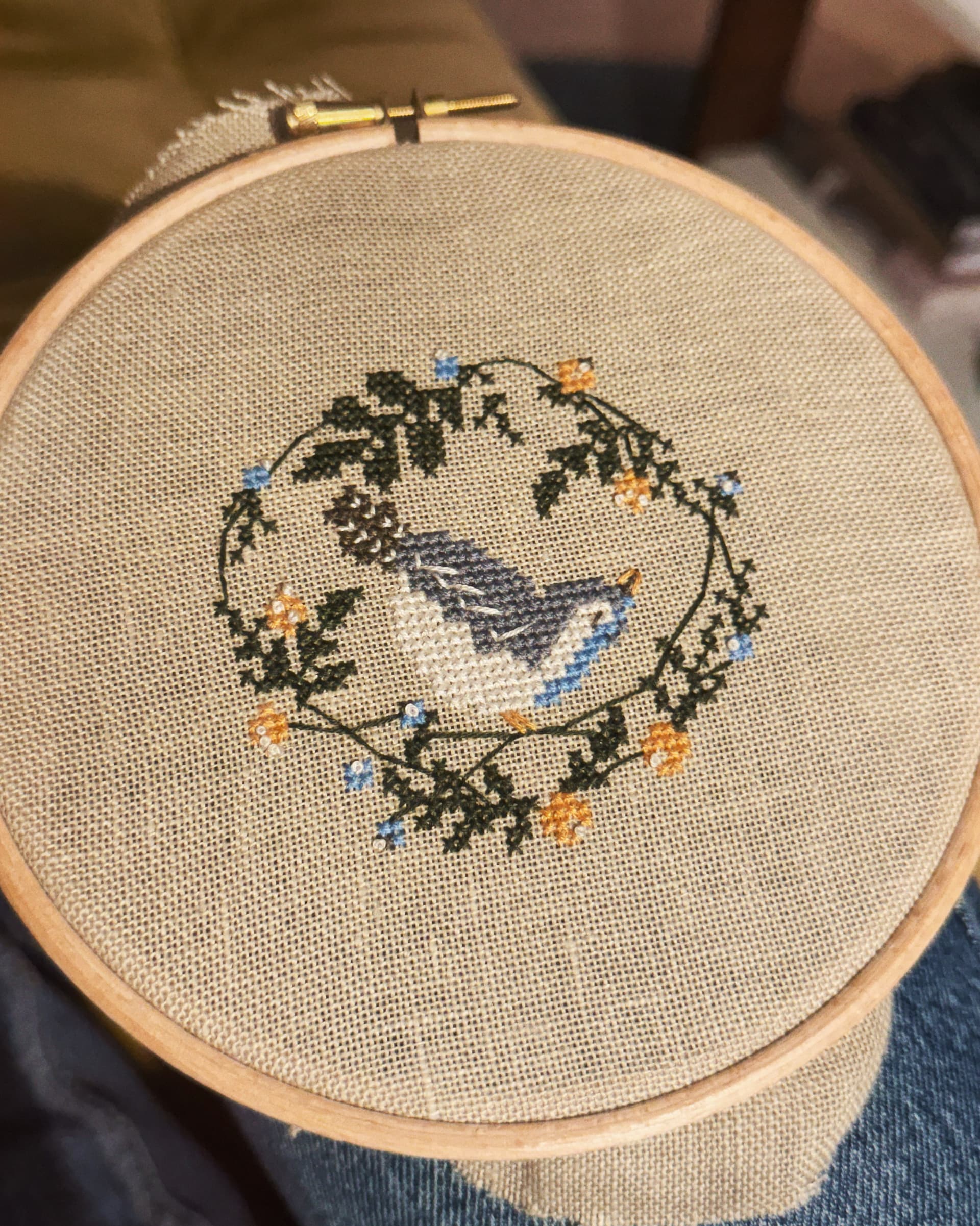 Ik heb voor het eerst in een lange tijd weer iets voor mezelf gemaakt. Ik zat in zo’n enorme borduur slop dat ik er gewoon somber van werd dat ik niks uit m’n handen kreeg (op dat cadeautje voor m’n tante na, maar dat was meer ‘moeten’). Ik ben gisteravond begonnen en heb het net afgemaakt. Dit is een lente vogeltje en heb een paar jaar geleden een winter versie hiervan gemaakt. Denk dat ik zo maar aan de zomer versie ga beginnen. Het is fijn om aan iets te beginnen en het af te maken, goede motivatie