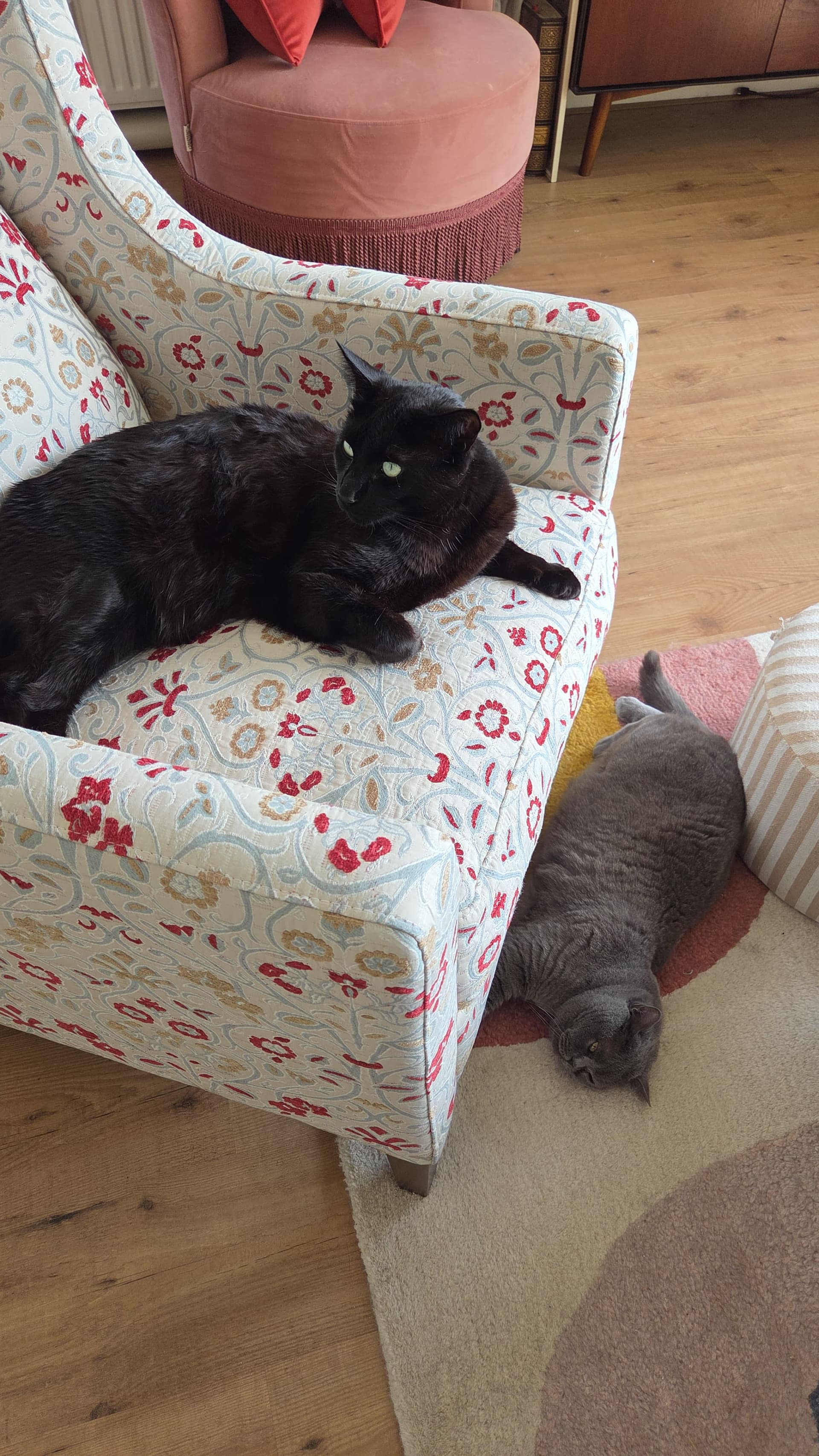 de stoel ondersteunt mân rug zo goed en de armleuningen zitten op een perfecte hoogte voor borduren. Ik heb âm sinds donderdag binnen en ik heb er het hele weekend ingezeten. Ik ben zo blij eindelijk een goede borduurstoel te hebben en ik vind âm ook zo mooi! Moest zo lang wachten ivm de stof. Het is een jacquard, dus het patroon is erin geweven. De ultieme oma stoel dit haha