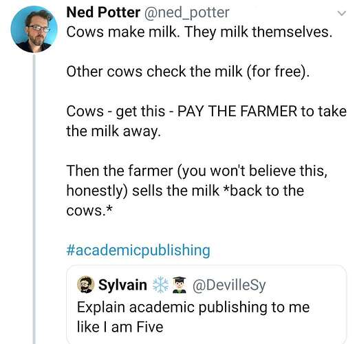 Haha ja echt zo, als werkloze net-afgestudeerde, heel chill. Ik had toen gelukkig net een behoorlijke geldprijs gewonnen voor die scriptie, dus daarmee heb ik de publicatiekosten toen betaald. Ik moet wel zeggen dat ik me toen totaal niet besefte hoe raar dit eigenlijk is, en dat ik het graag zelf wilde betalen uit een soort trots :â) Waar ik toen werkte was er wel een regeling dat open access kosten vergoed werden door de universiteit, maar niet bij Elsevier journals, omdat die niet volledig open access zijn.