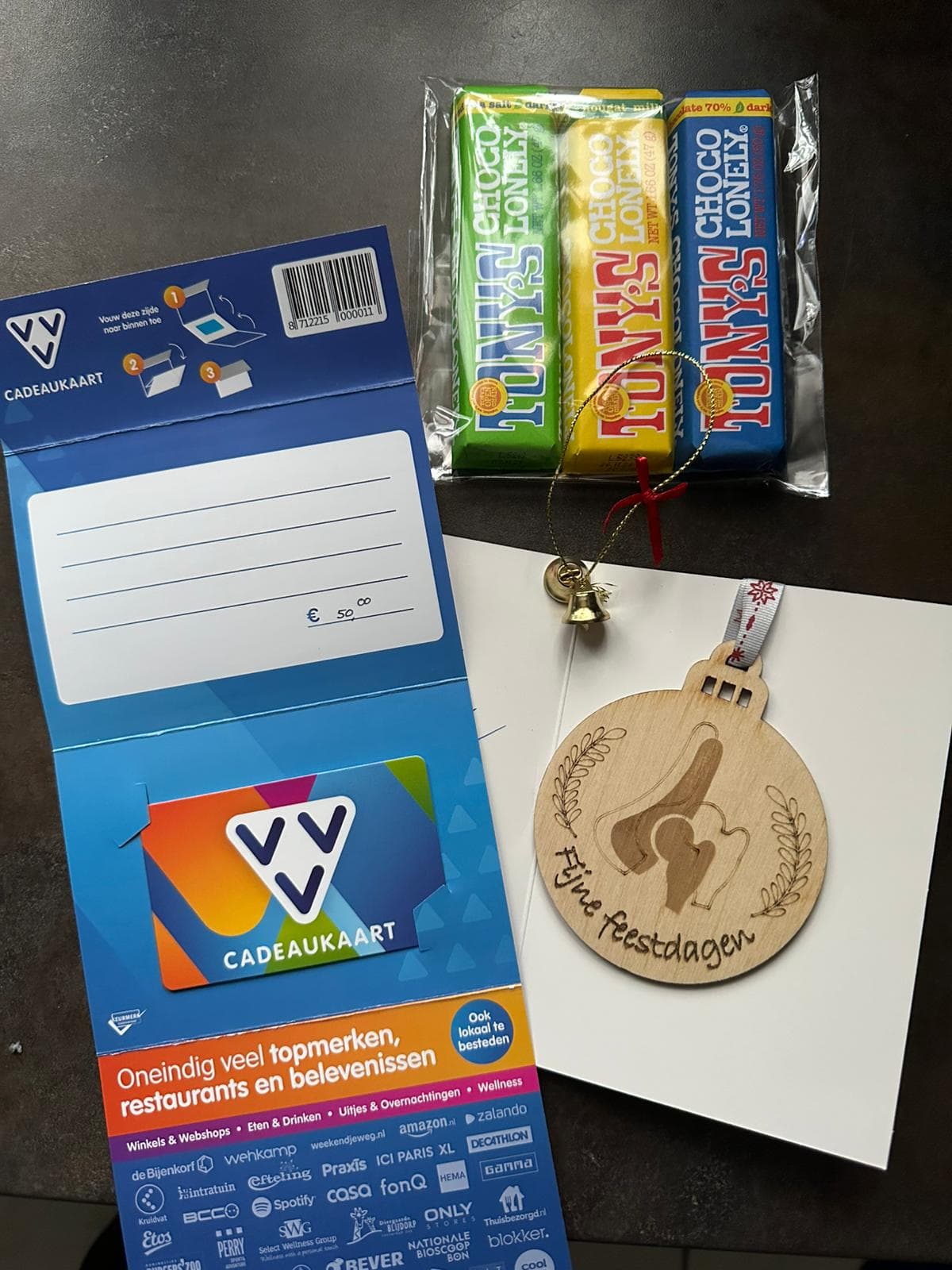 Ik kreeg een klein reiskoffertje met het logo van m’n werkgever er op haha met daarin twee kandelaar/kaarsenhouders en twee kaarsen, een pak koekjes, een grote toilettas met het logo van m’n werkgever er op en een zak chips haha