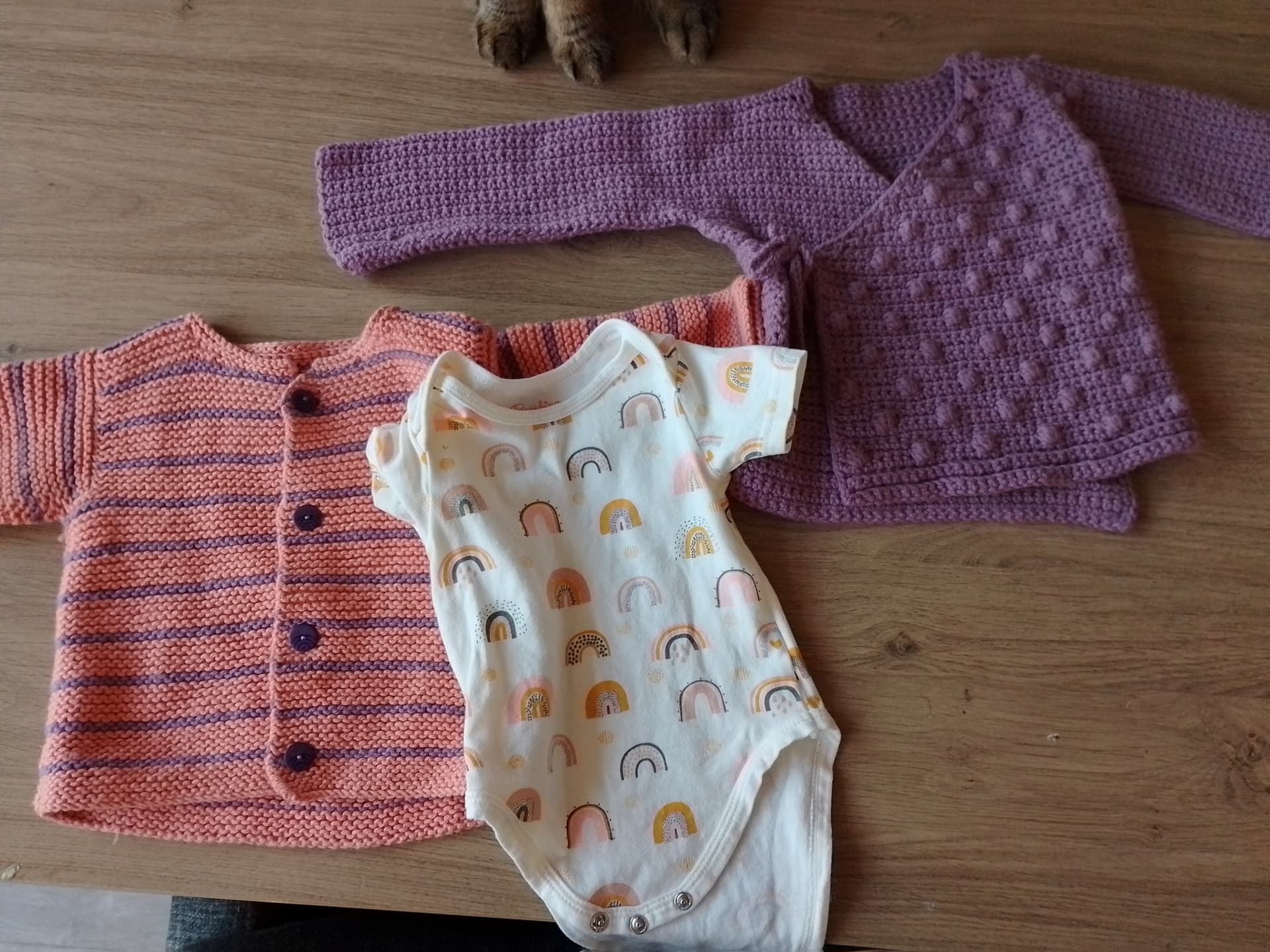 Engel jasje alvast een maat groter en wollen wantjes van Disana. Ik had fleece wantjes van de Hema, maar die werken voor geen meter. Hopelijk zijn deze beter!