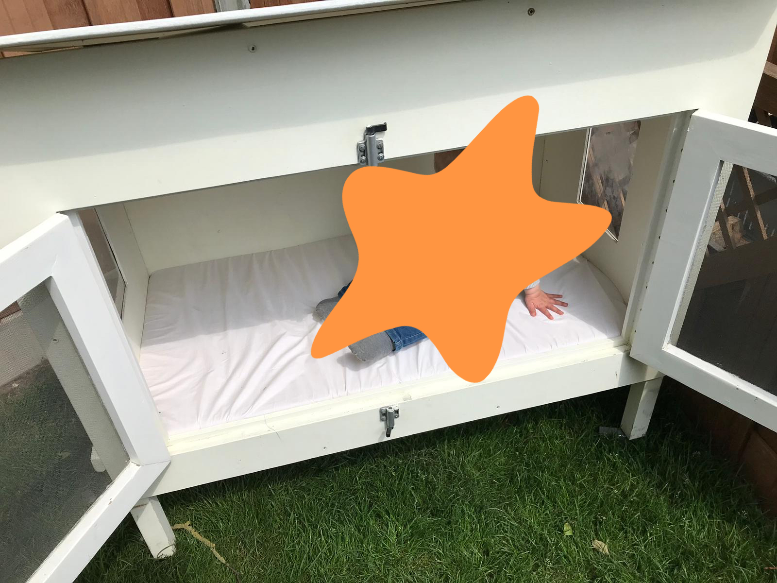 Ja F. slaapt er op het kdv altijd heel goed in. Ze deden deze weg omdat hij oud was en het gaas stuk was. Maar dat was zo gemaakt plus een likkie verf en hij is weer als nieuw!
