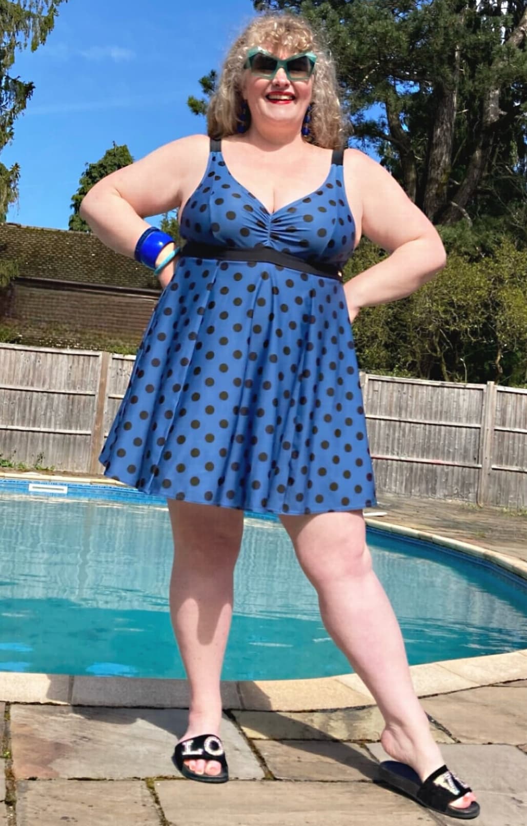 Het zwemjurkje bevalt zo goed dat ik een tweede exemplaar heb gekocht toen die in de sale was; nu eentje met stipjes in donkerblauw.
