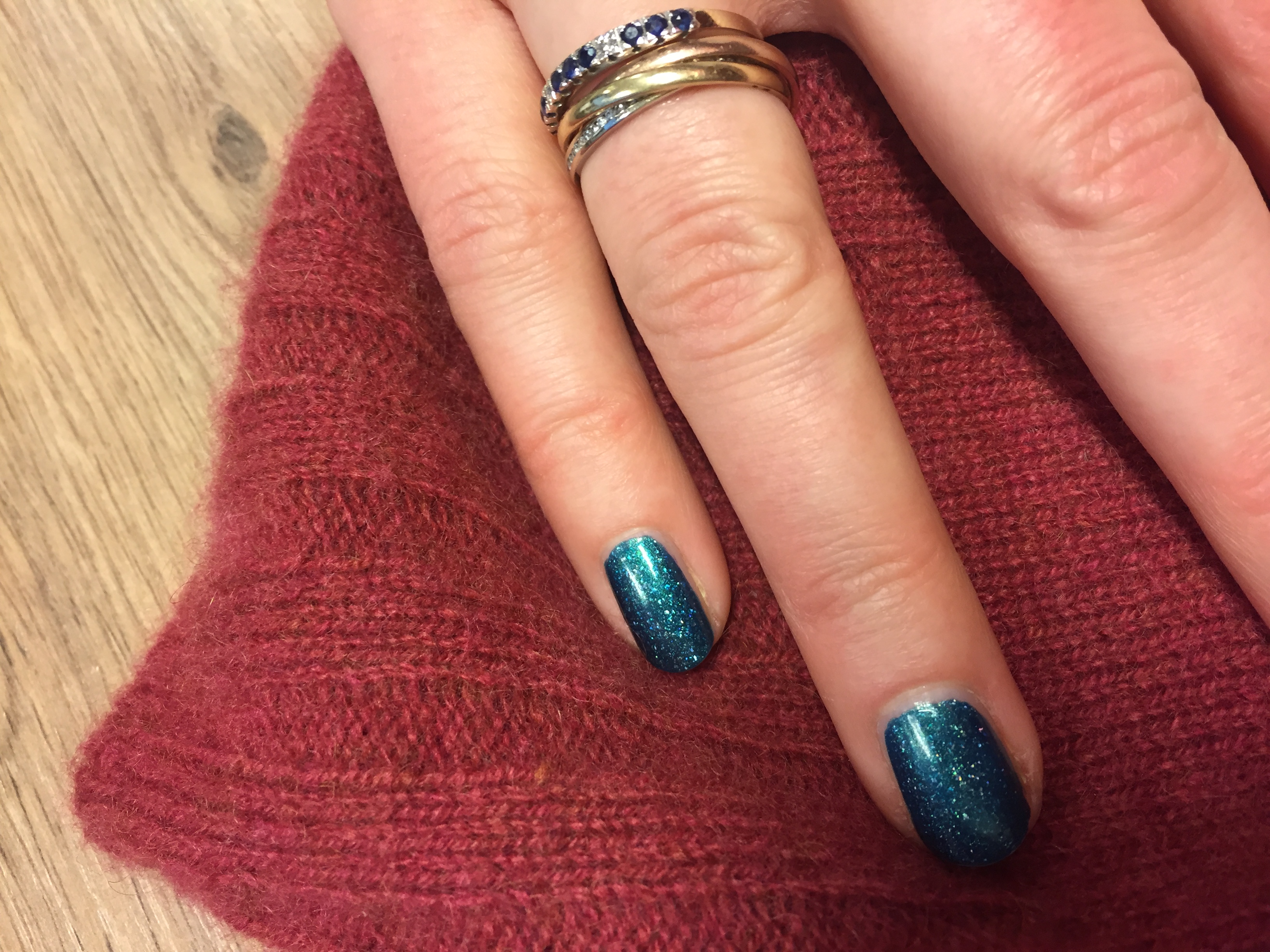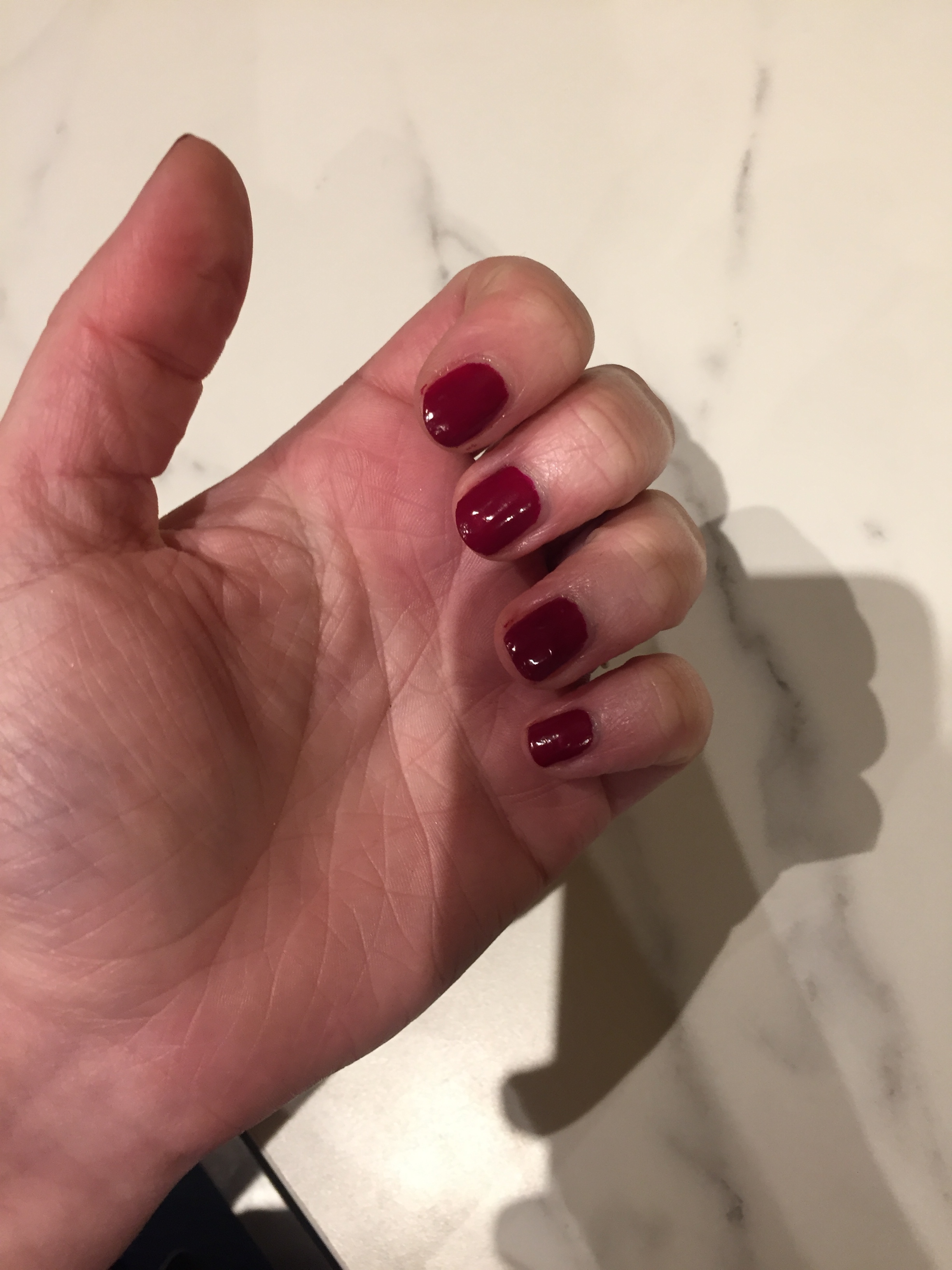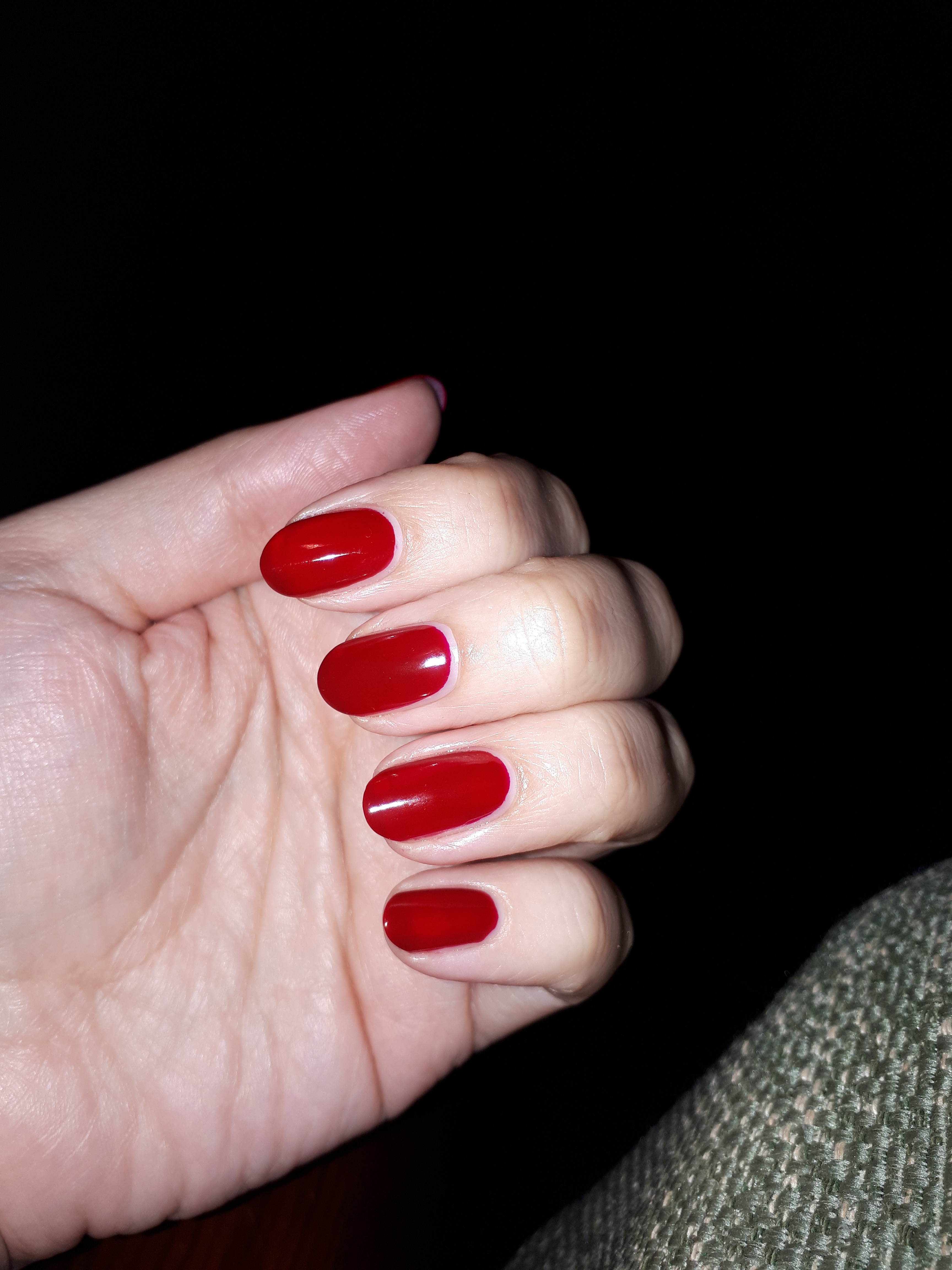 Ik heb hetzelfde kleurtje als drie dagen terug wat netter aangebracht, met basis en topcoat! Het was eigenlijk niet nodig, want hij zat er nog perfect op, maar hopelijk gaat hij zo de hele week mooi mee.
