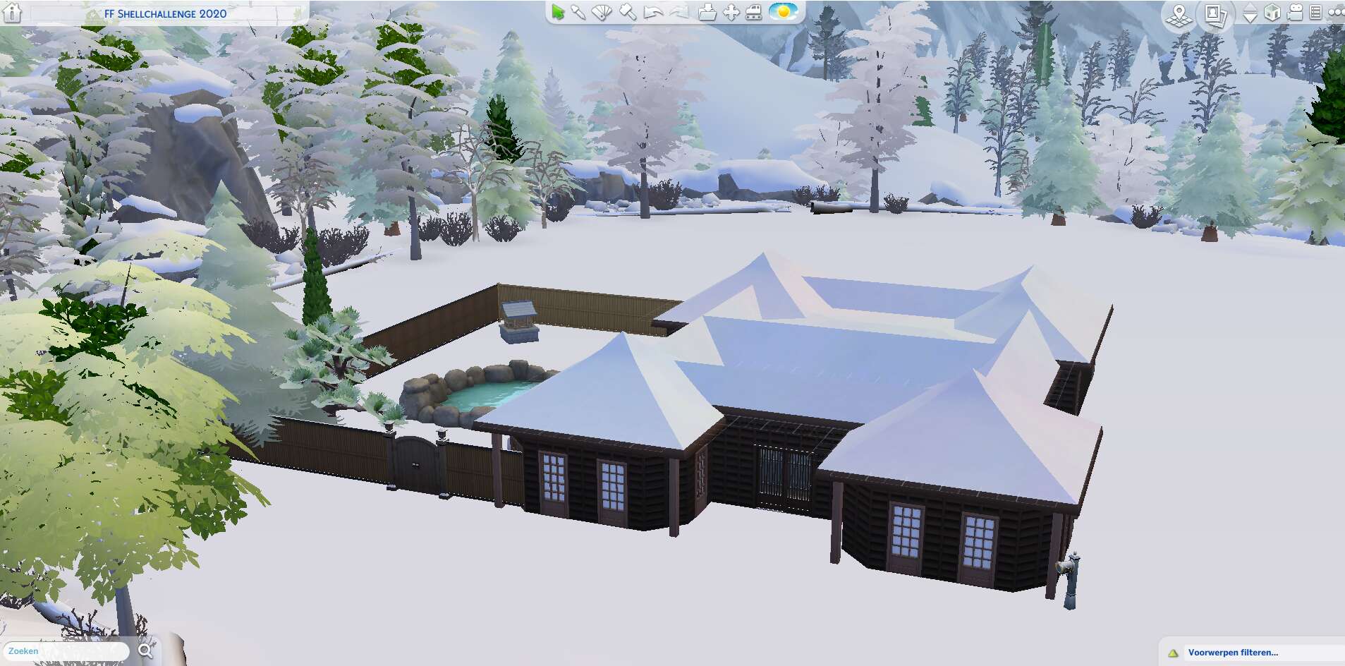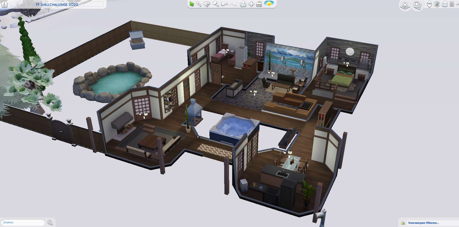 Ik ben klaar! Vond het een erg leuke challenge. Heb er een vakantiehuis van gemaakt voor skiërs/snowboarders. Voor een gezin met 4 personen. Van de open ruimtes heb ik twee binnenplaatsjes gemaakt. Eentje met een sauna en eentje met een hottub. Het gedeelte met de sauna heeft een glazen dak maar dat zie je nu niet zo goed haha. Buitenkant ben ik niet zo tevreden over maar wist niet zo goed wat ik er nog meer van kon maken.