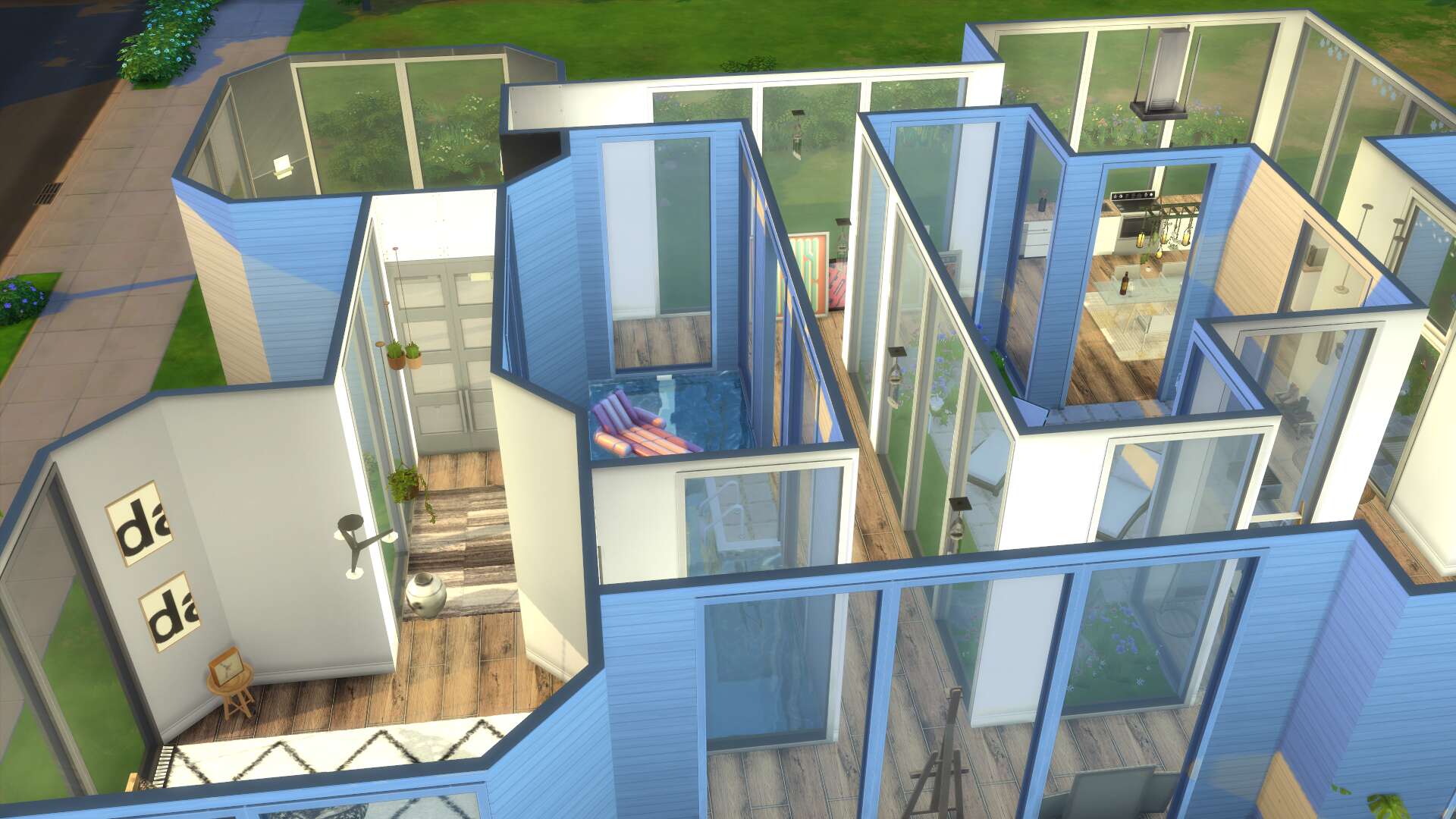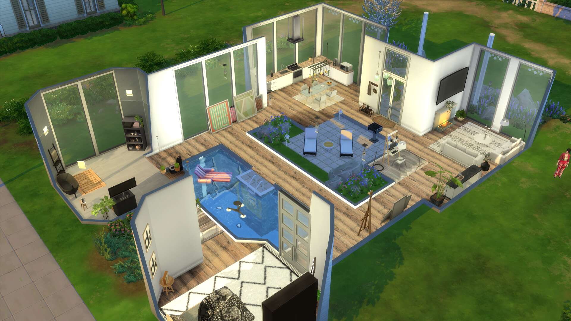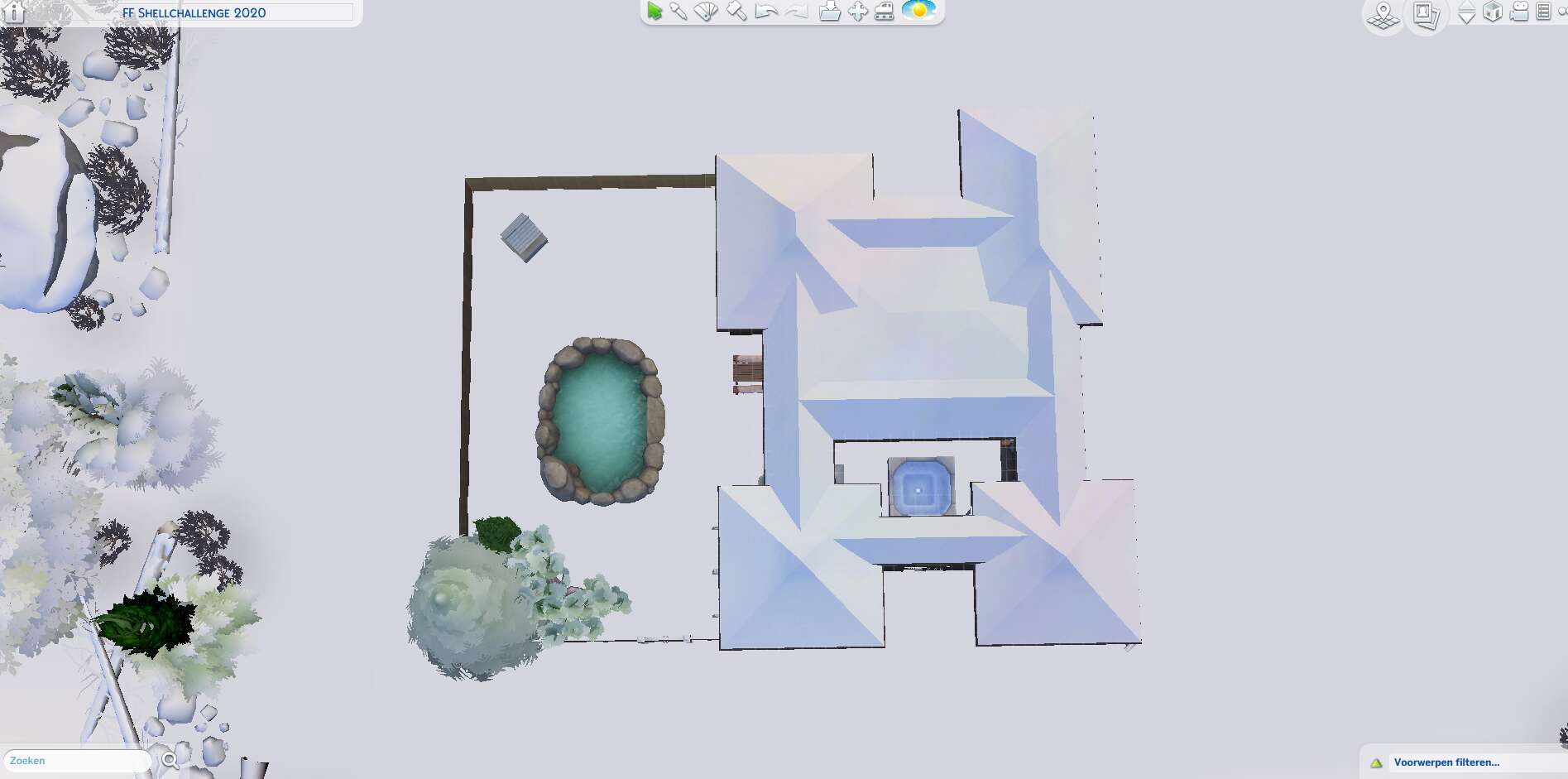 Ik heb 'm ook af! Het is een beetje een vreemd huis geworden (en met alle binnenmuren en ramen waren screenshots lastig), met als binnenplaatsjes een tuin en een zwembad