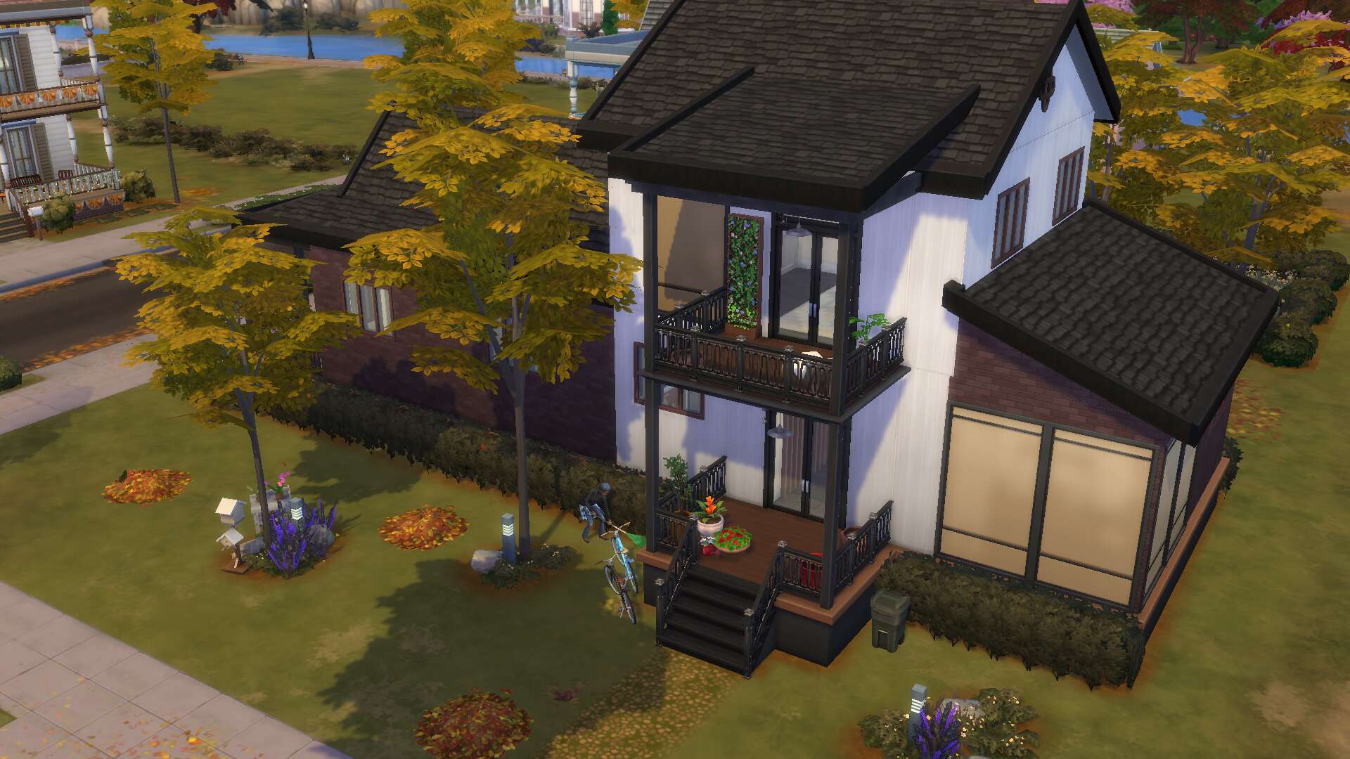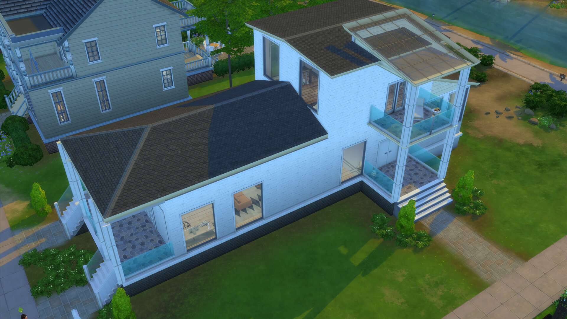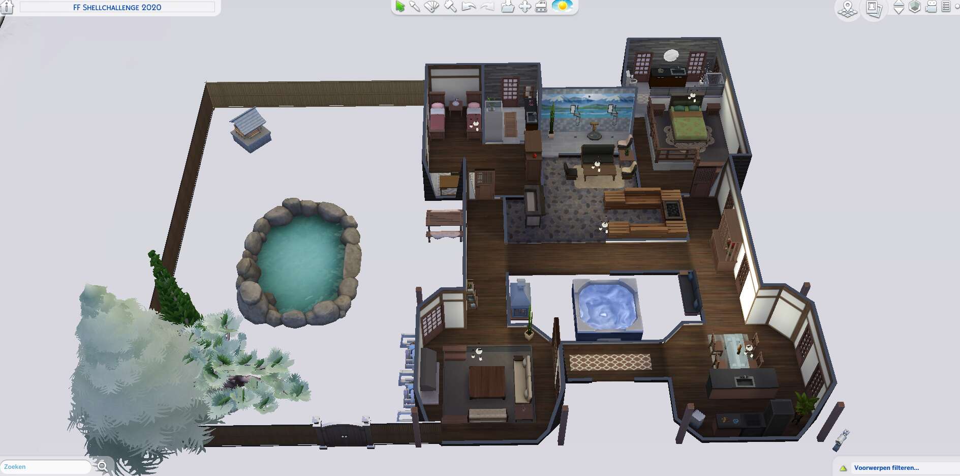 Ik heb 'm ook af! Het is een beetje een vreemd huis geworden (en met alle binnenmuren en ramen waren screenshots lastig), met als binnenplaatsjes een tuin en een zwembad