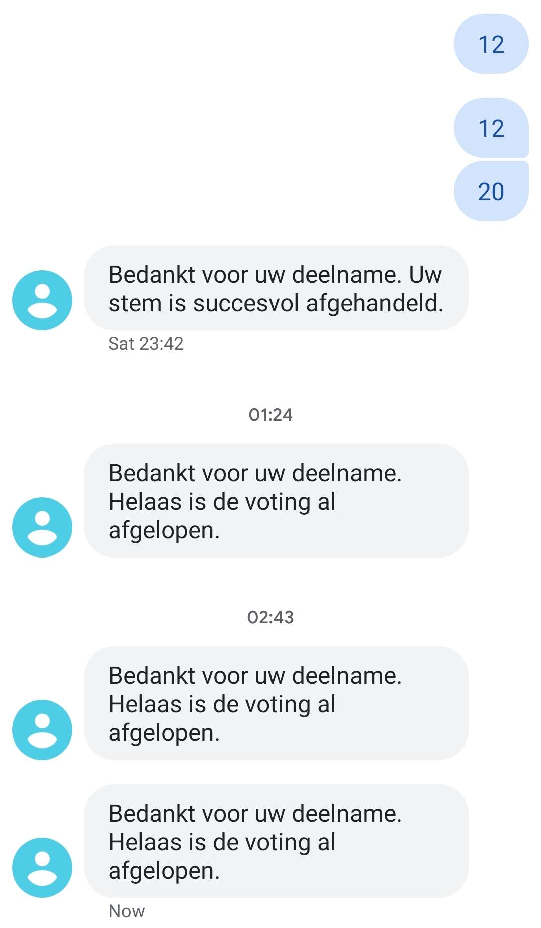 Ik heb ook niet kunnen stemmen. Blijkbaar zit er op een of andere manier een blokkade op mijn nummer? En blokkade verwijderen kan dus alleen maar om te bellen naar klantenservice provider(die dus dicht is). Vaag gedoe