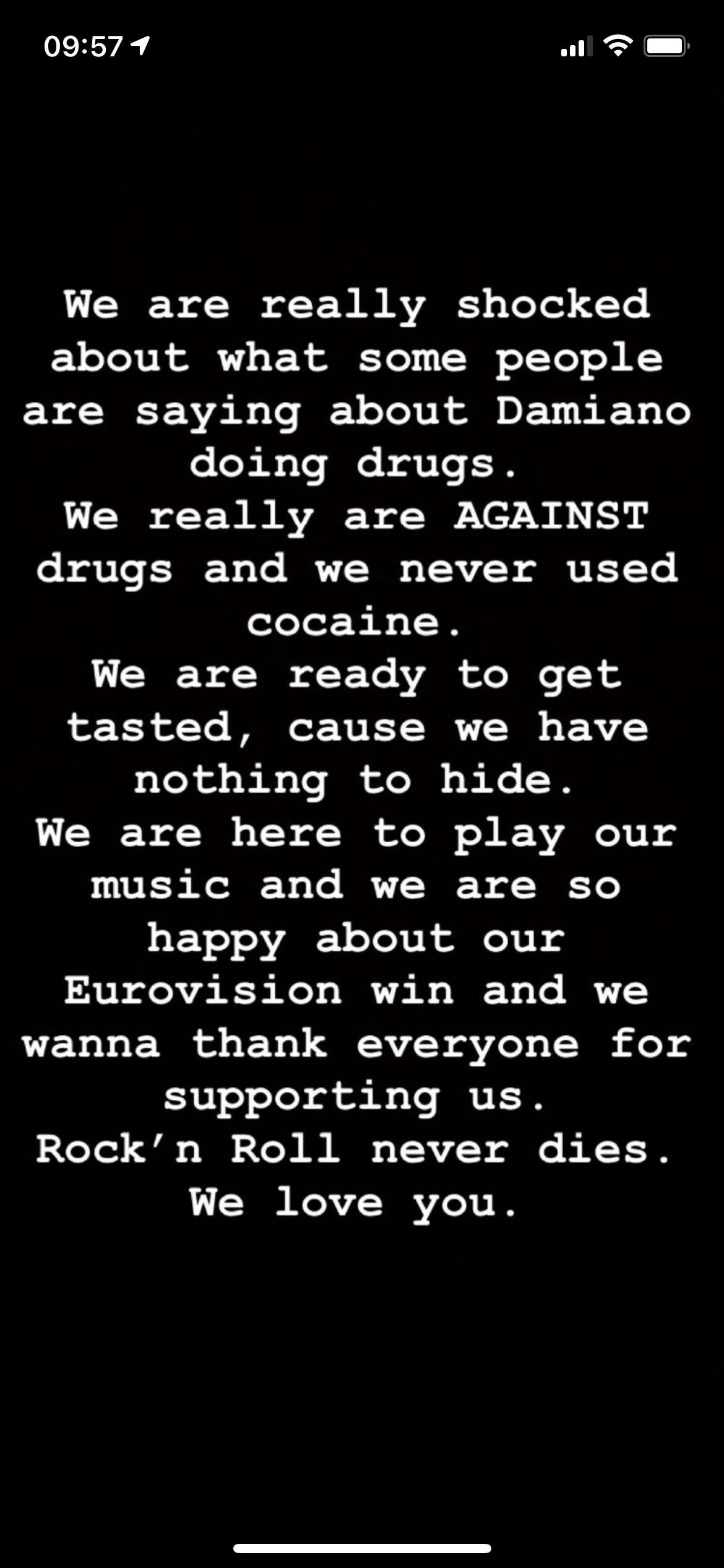 Italië heeft ondertussen ook een statement gemaakt dat ze geen drugs gebruikten en hebben zelfs gezegd dat ze een drugstest willen ondergaan dus ik vind het wel sneu dat dit zo groot is geworden. Win je een keer het songfestival en dan gaat het door een ongelukkige camerahoek en een gekke houding vooral over of je wel of geen drugs aan het snuiven was.