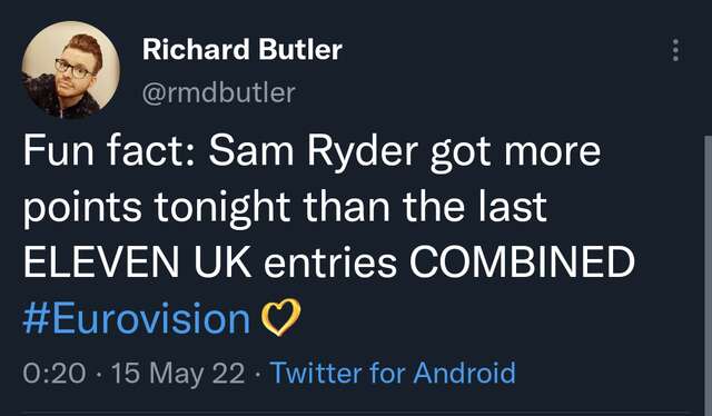 Ik had die punten van OekraĆÆne wel verwacht eigenlijk. Gevoelig liedje over verdriet, met emotie gezongen, kan me zo goed voorstellen dat dat normaal misschien niet zou aanslaan bij de OekraĆÆners maar nu wel.
