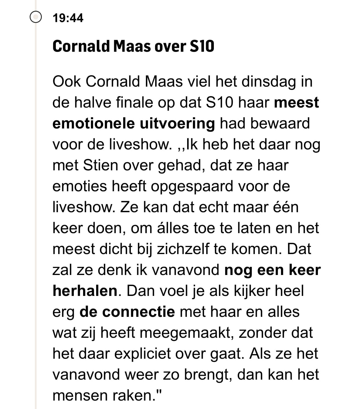 Haha wat een gek stuk. Aan de ene kant kan S10 het maar één keer en aan de andere kant gaat ze het vanavond herhalen ![]()