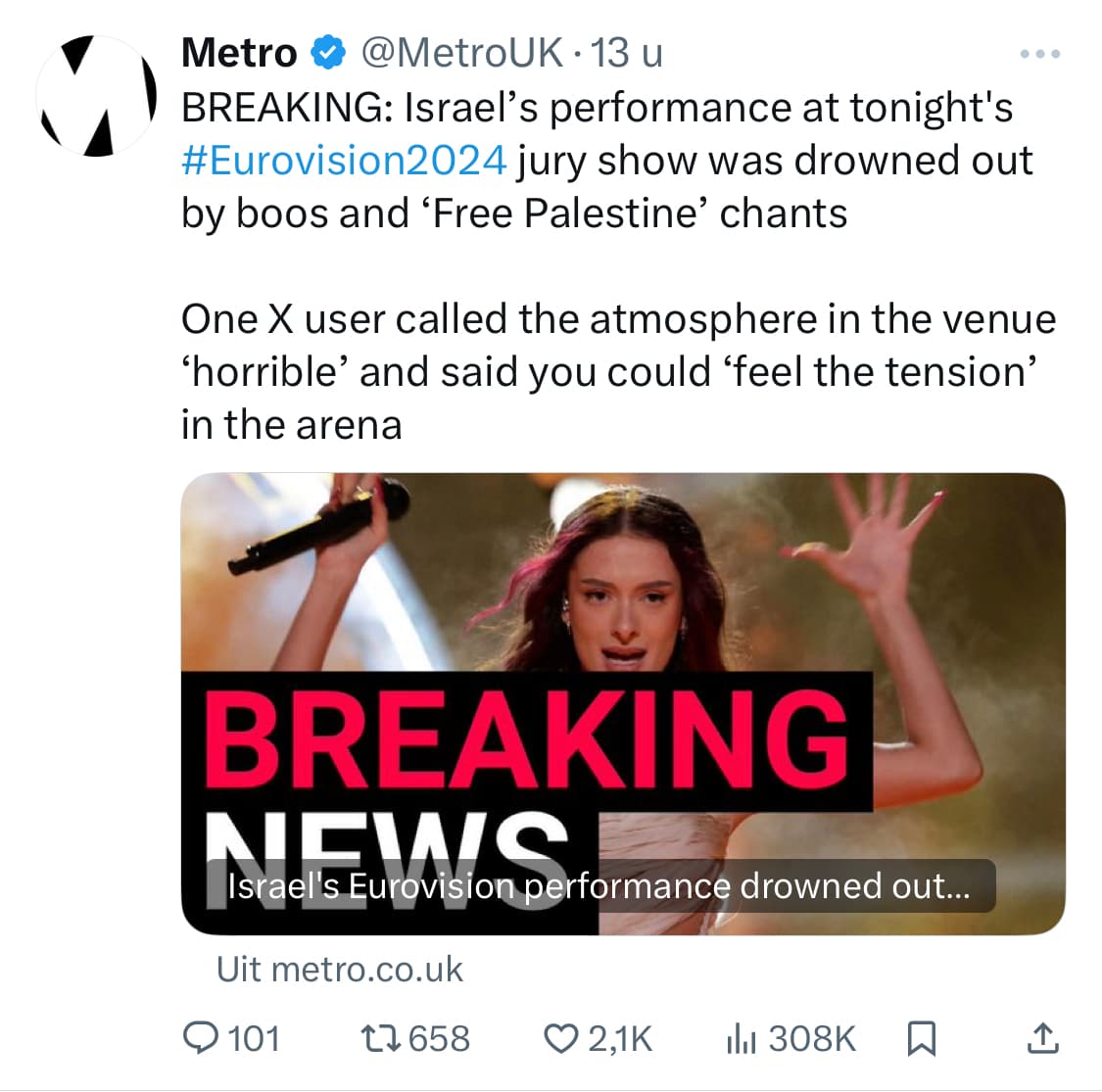 Dat zou me extreem verbazen, hij is niet bepaald activistisch bezig voor Palestina. De inzending en de hele campagne eromheen is peak navelstaren. Toen er in de media gevraagd werd of het wel gepast was om naar Malmö te gaan was zijn reactie niet echt sympathiek ofzo, hij nam totaal geen eigen verantwoordelijkheid. Plus: Joost bracht vlak na de inval in Oekraïne dat “I love Russia” liedje uit, en toen hij commentaar kreeg ging hij en Avrotros vooral zichzelf verdedigen dat ze het Russische regime niet steunen. Ze staan er geen moment bij stil hoe ongepast en toondoof zoiets is, ook als je het regime niet steunt. Van zulke mensen verwacht ik niet dat ze op het moment suprême hun nek zullen uitsteken voor Palestina.