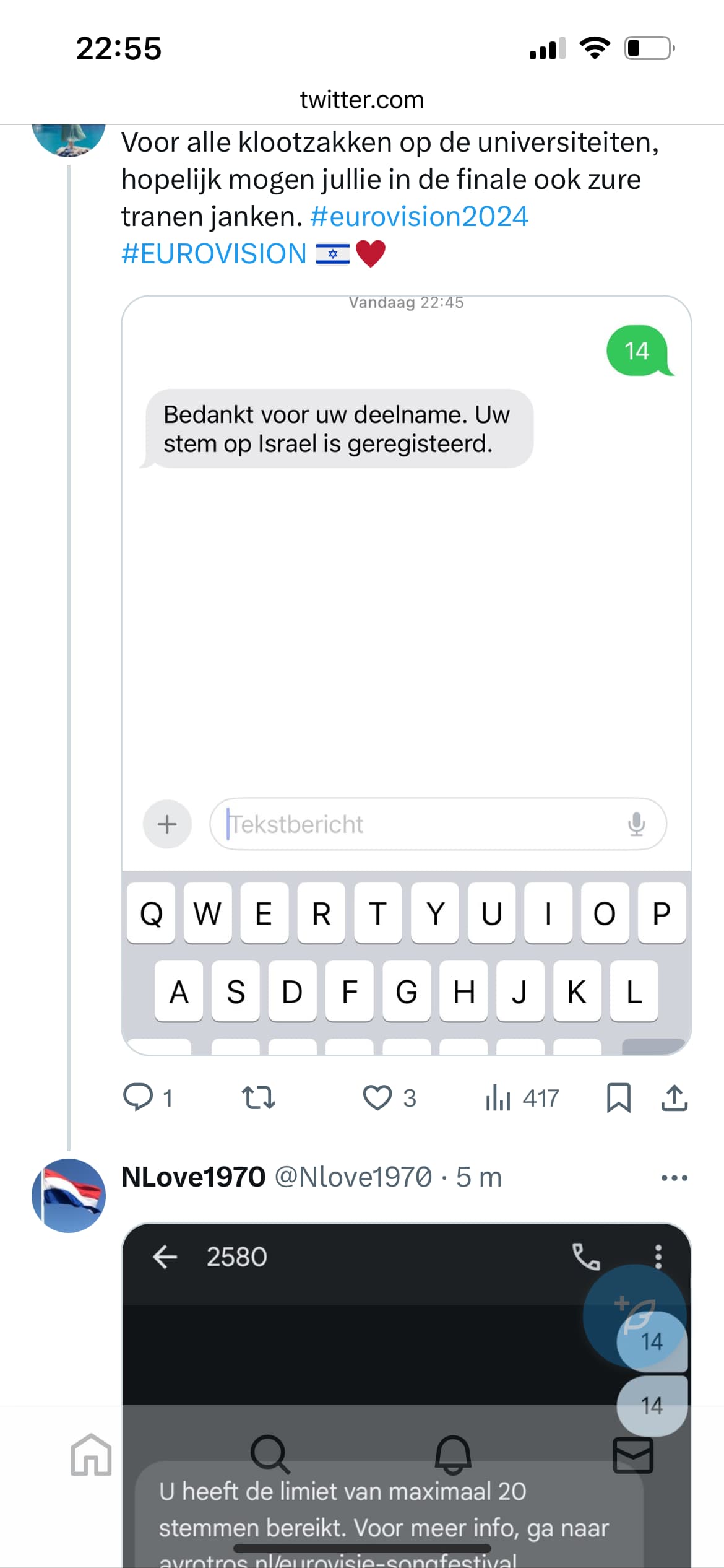 Ik denk dus echt dat IsraĆ«l nog echt hoog gaat eindigen door al die pro-IsraĆ«l stemmen, ook van mensen die geen Eurovisie kijken. Zweet in mān naad bij de gedachte dat ze dan straks ook nog bijna winnen ook.