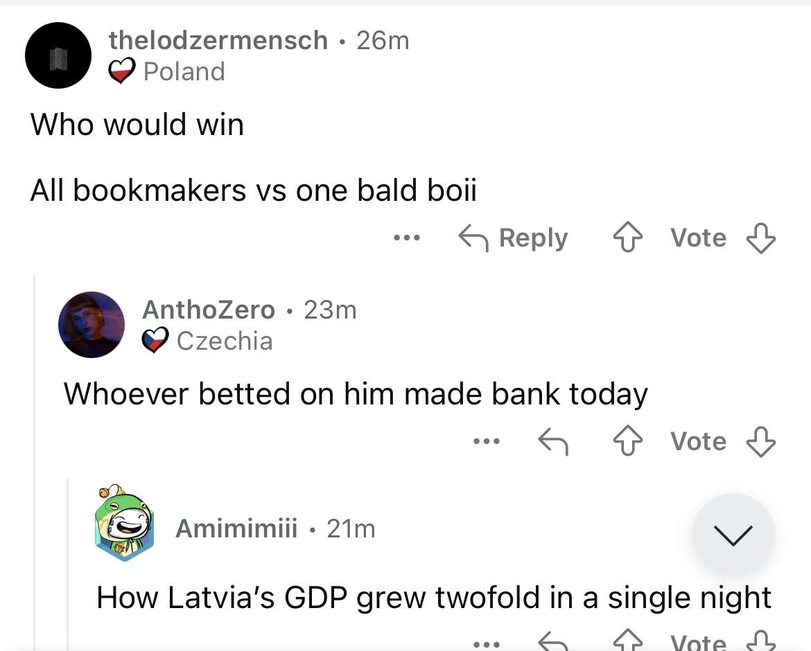 Zeker waar! Maar ik dacht misschien dat er 1 land is waar veel mensen op gaan stemmen om zo israƫl lager te laten eindigen.