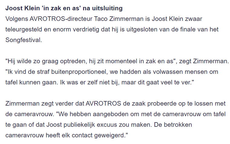 Letterlijke tekst van directeur Avro: “Ondanks vooraf gemaakte afspraken dat Joost niet gefilmd zou worden bij het verlaten van het podium, werd hij toch gefilmd. Er stond een cameravrouw en hij heeft de vrouw meerdere keren gevraagd hem niet te filmen. Daar ging zij toch mee door. En toen heeft hij een dreigende beweging naar haar camera gemaakt. overigens zonder haar aan te raken. Dat heeft vervolgens geleid tot een melding bij de EBU en de Zweedse politie en de EBU heeft vervolgens besloten Joost te diskwalificeren.”