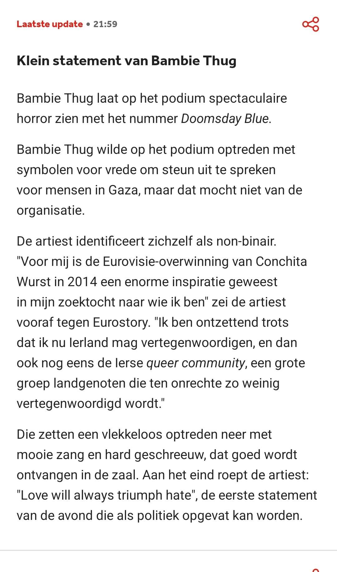 Ik vond Bambie donderdag wel beter zingen dan vandaag, maar ik ben alsnog fan. Zou leuk zijn als hen wint maar verwacht het niet - zal (hopelijk) Zwitserland worden en niet DatLand.