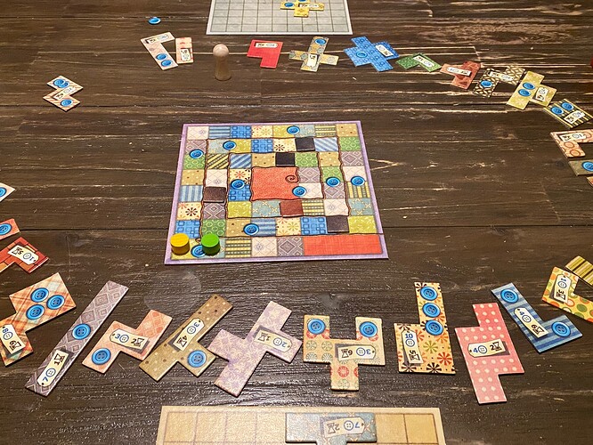Wij hebben gisteravond voor het eerst Patchwork gespeeld. We vonden het beiden erg leuk! Het was wel even zoeken naar wat een goede tactiek was: ga je je richten op je tableau ‘netjes’ vullen, of liever meters maken of kaartjes neerleggen met zoveel mogelijk knopen erop. Dit vond ik wel een leuke dynamiek.