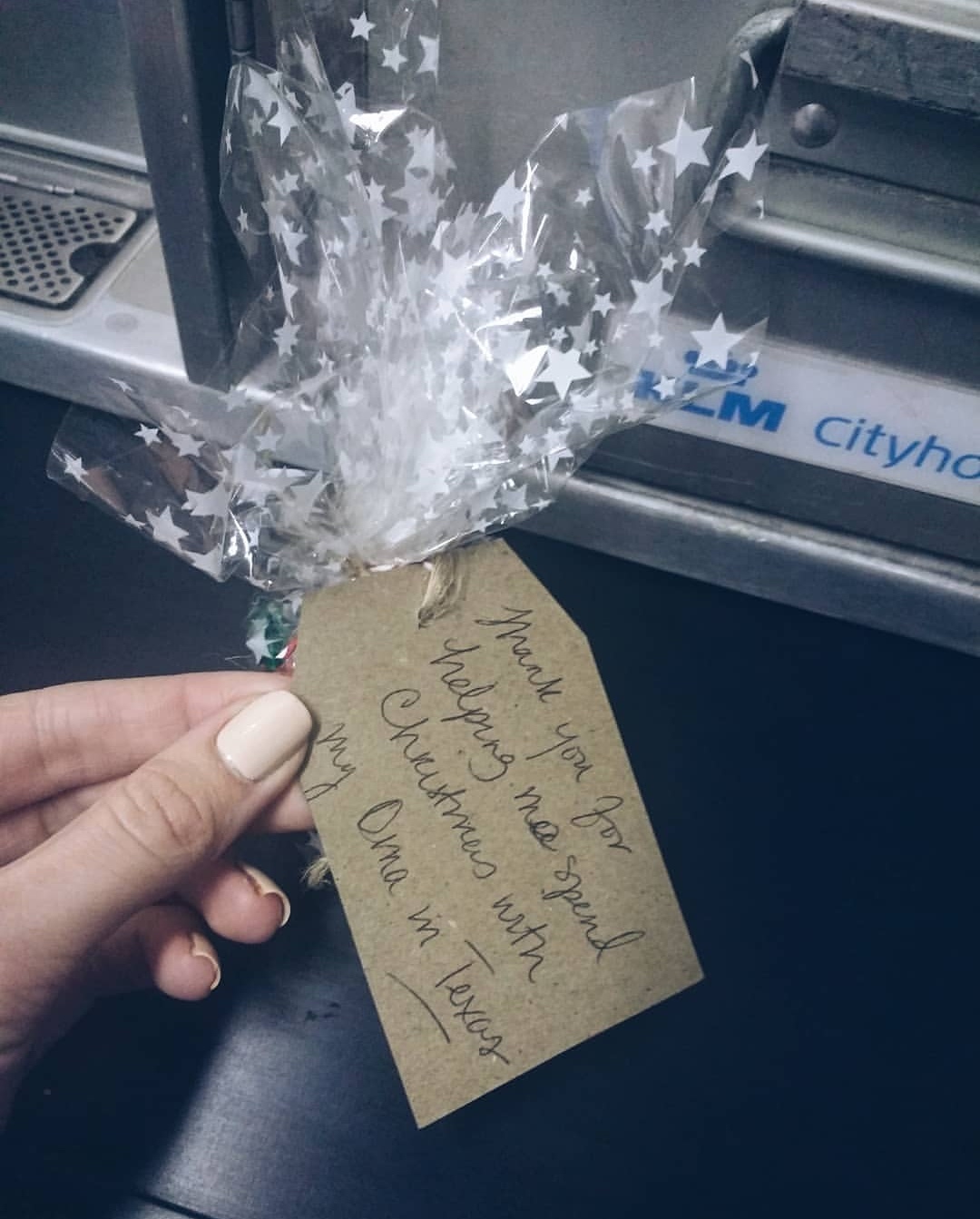 Ik heb altijd verschillende kaartjes bij me en schrijf dan een persoonlijk kaartje voor diegene. (doe ik ook met verjaardagen, huwelijk of als ik in een gesprek met een passagier achter iets kom wat mij raakt of zie dat de persoon in kwestie ergens mee zit of juist heel blij voor iets is)