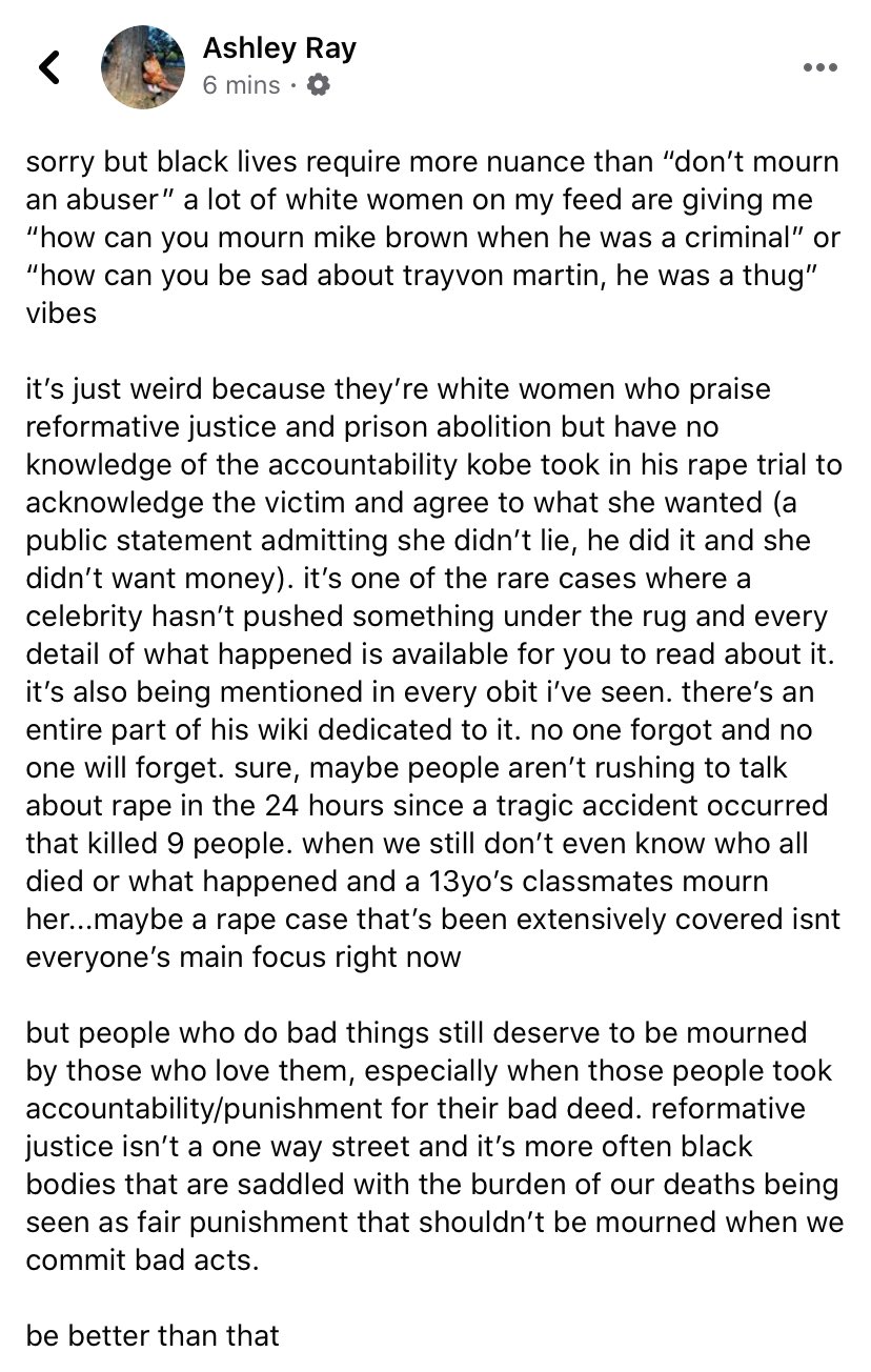 Ik snap niet waarom het hier toe doet dat hij zwart was en dat de vrouwen op haar feed commentaar geven wit zijn. Zou het echt anders zijn als een witte man dood was gegaan in een ongeluk? Zouden we het dan niet over een verkrachting hebben?