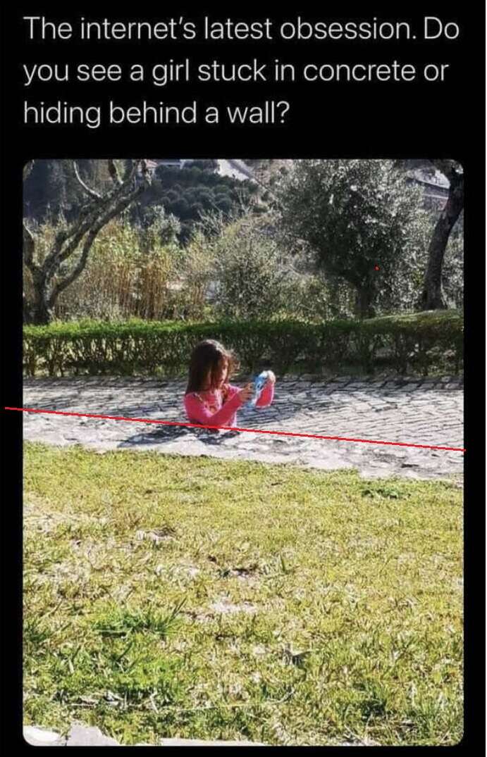 Weet niet of dit helpt, maar ter hoogte van die lijn zegmaar is de rand van een muurtje waar dat meisje met haar arm op leunt, en ze staat dus op een pad wat lager ligt. Als je goed kijkt zie je dat het patroon van dat muurtje ook anders is dan het weggetje erachter.