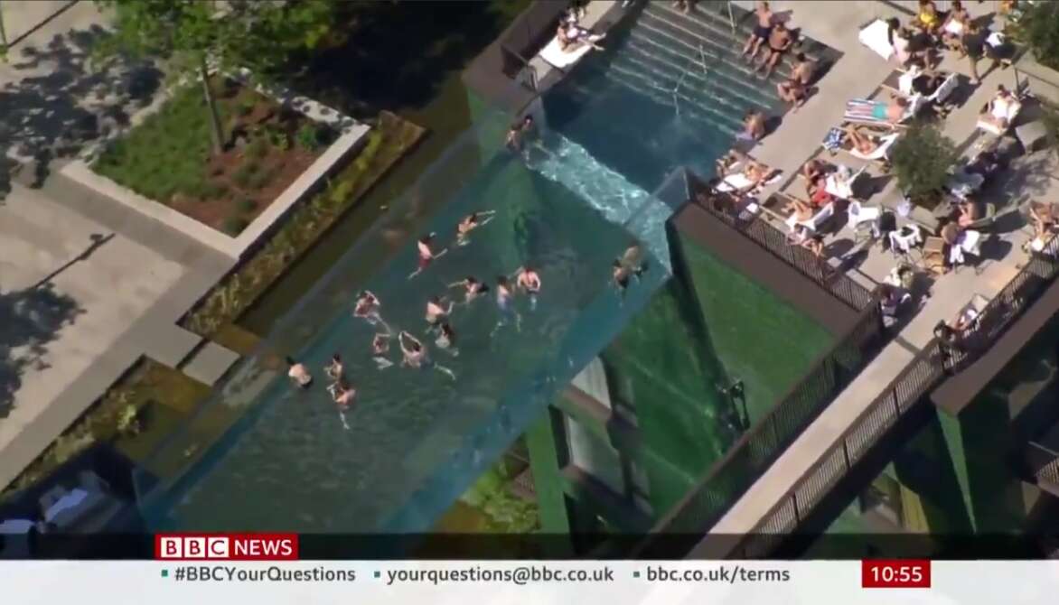 Zou jij in dit glazen zwembad tussen 2 wolkenkrabbers durven?