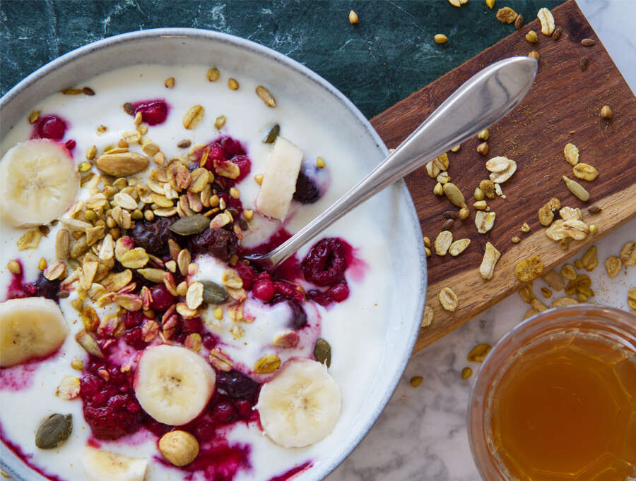 - toppings naar keuze, zoals een lepel pindakaas, (bevroren) fruit, chiazaad, dot kwark, hagelslag, noten, whatever u want