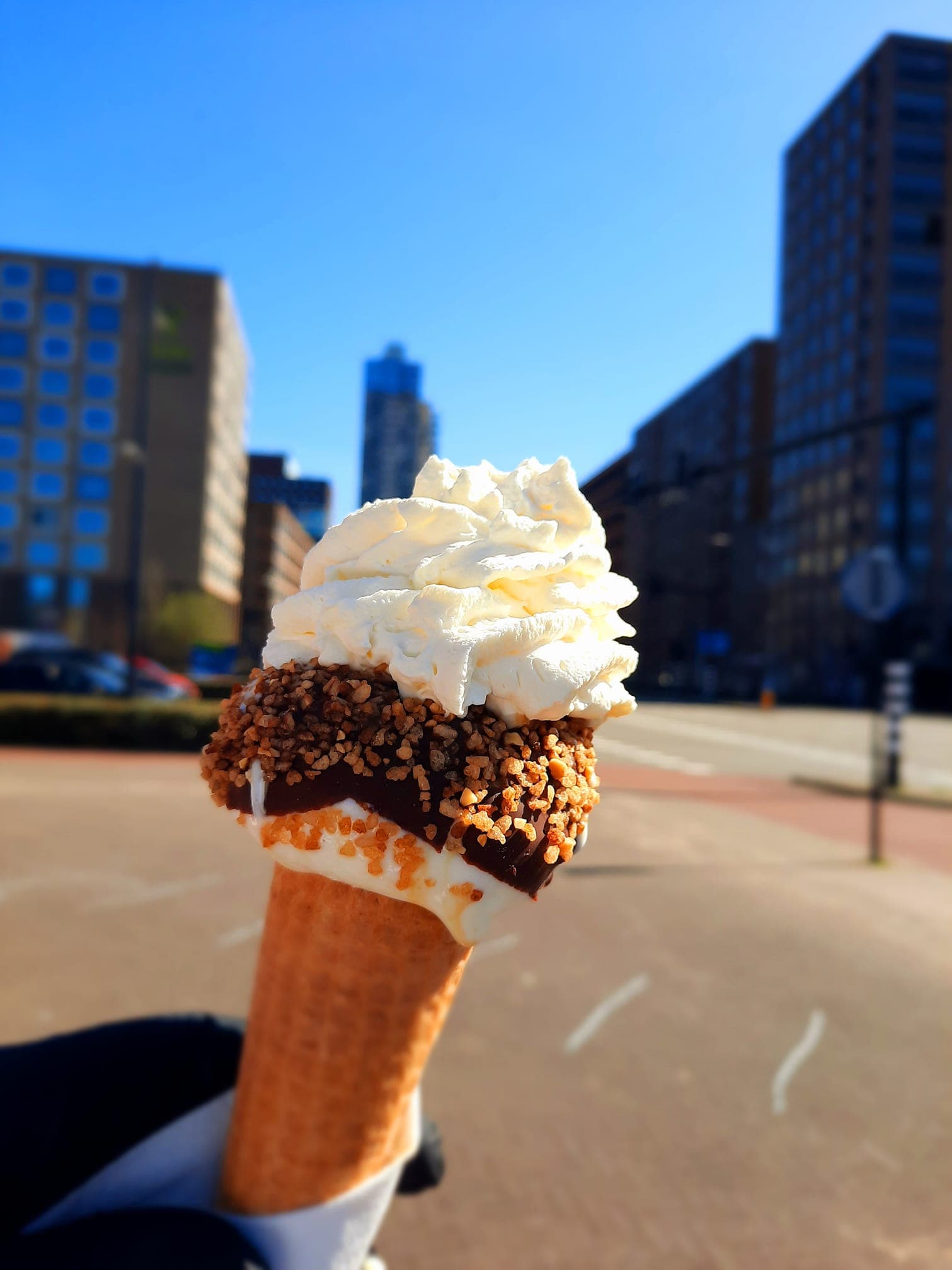 Mijn vriend kwam een paar jaar geleden ook met dat idee om slagroom in het hoorntje te doen en ik vond het zo geniaal haha. Ik snap niet waarom ijssalons dat niet standaard doen. Dan eindig je met iets lekkers ipv zo’n kartonnen hap.