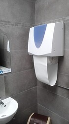 Zo’n rol is een goede tweede. het zou dan wel handig zijn dat diegene die zijn handen gedroogd heeft de rol naar beneden trekt zodat de volgende meteen een schoon stuk heeft.