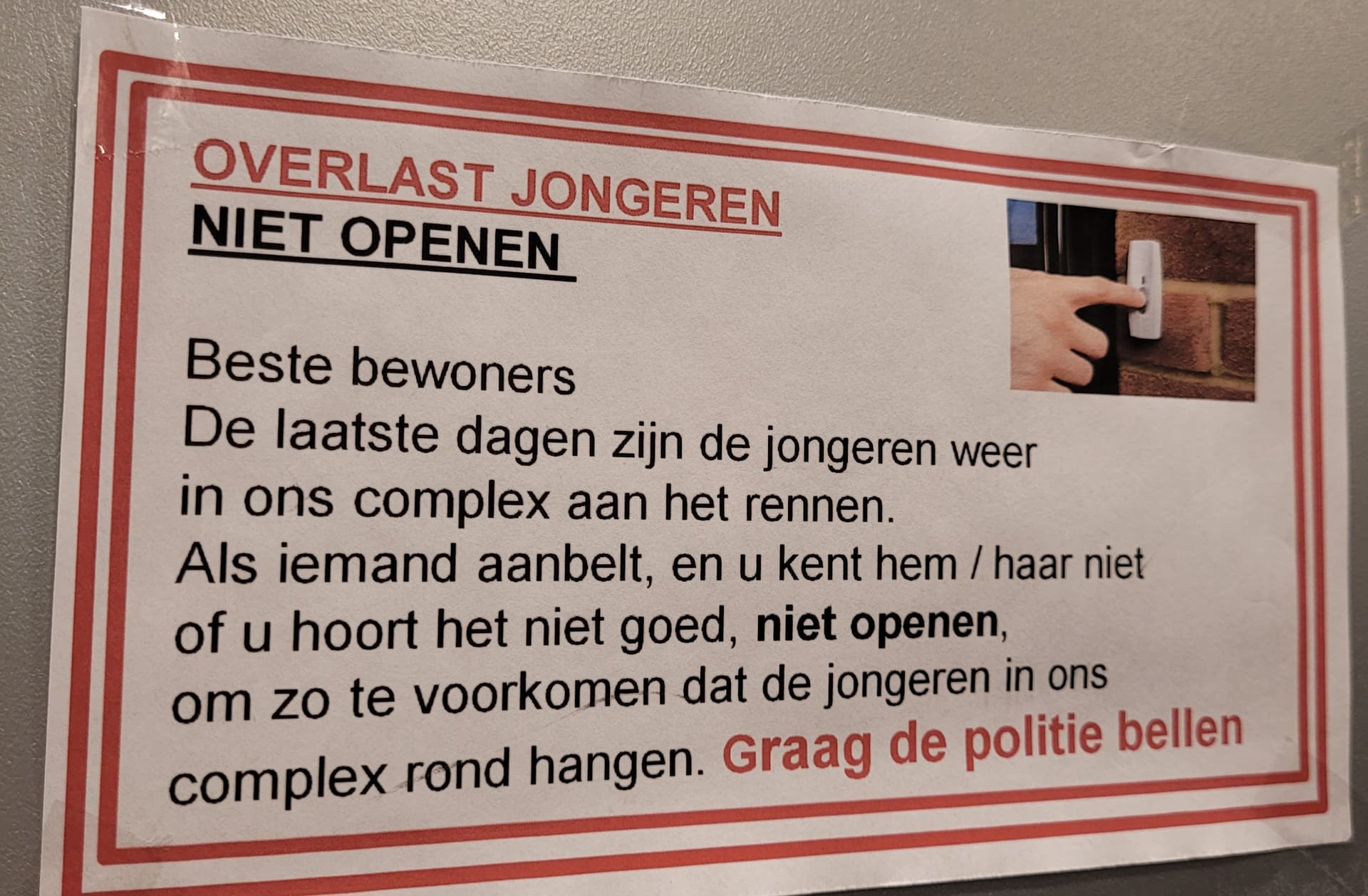 Dit gesprek doet me denken aan een briefje dat in de lift hangt bij mijn ouders. Ik moest zo hard lachen om ‘de jongeren’.
