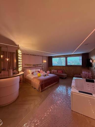 Nu heb ik vorig jaar na oud en nieuw direct voor mijn dochter en ik de Pink Suite in het Van der Valk in Breda geboekt. Alles is dus roze en er zit een groot bad binnen in de kamer en een sauna.