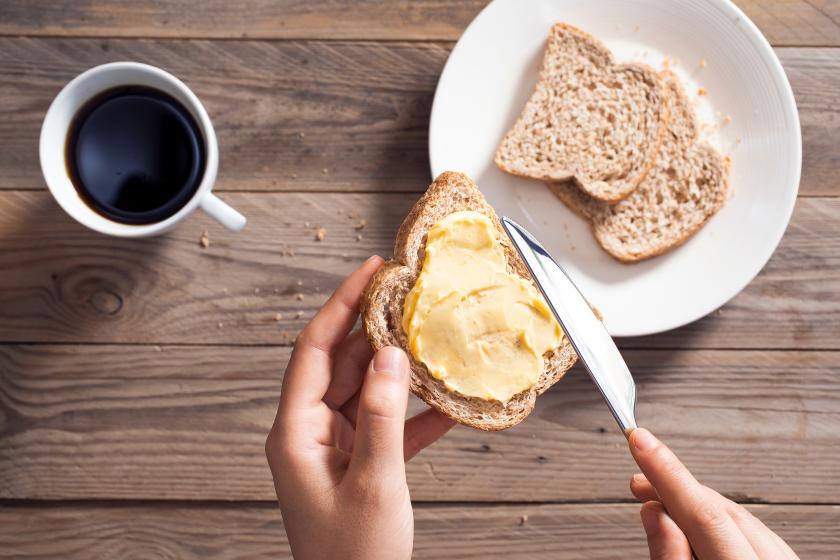 Als ik goede roomboter eet doe ik ook veel. Maar ik smeer ook nog wel eens iets plantaardigs en dan vind ik een laag echt vies