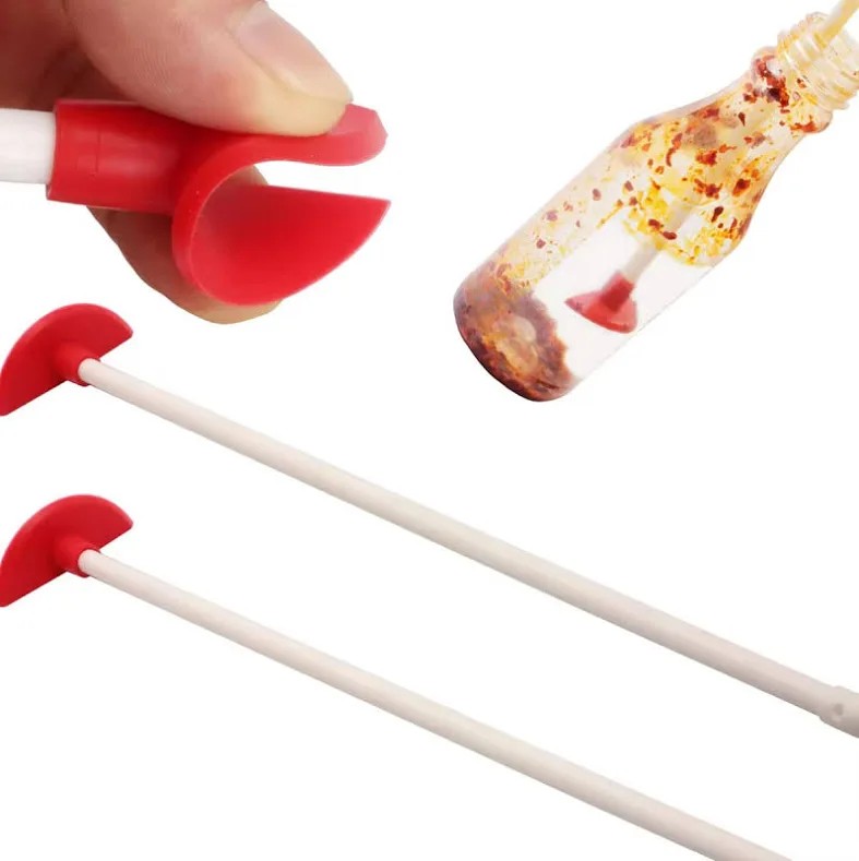 Het is een pannenlikker, geen flessenlikker (die uit de post van @Kauai ). Dus wel geschikt om je beslagkom goed leeg te krijgen met je cakebeslag, maar niet om je fles ketchup leeg te maken, daar past het niet in. Of het moet een kleine variant zijn, maar een pannenlikker is normaal gezien groter dan een flessenlikker en heeft een andere vorm.